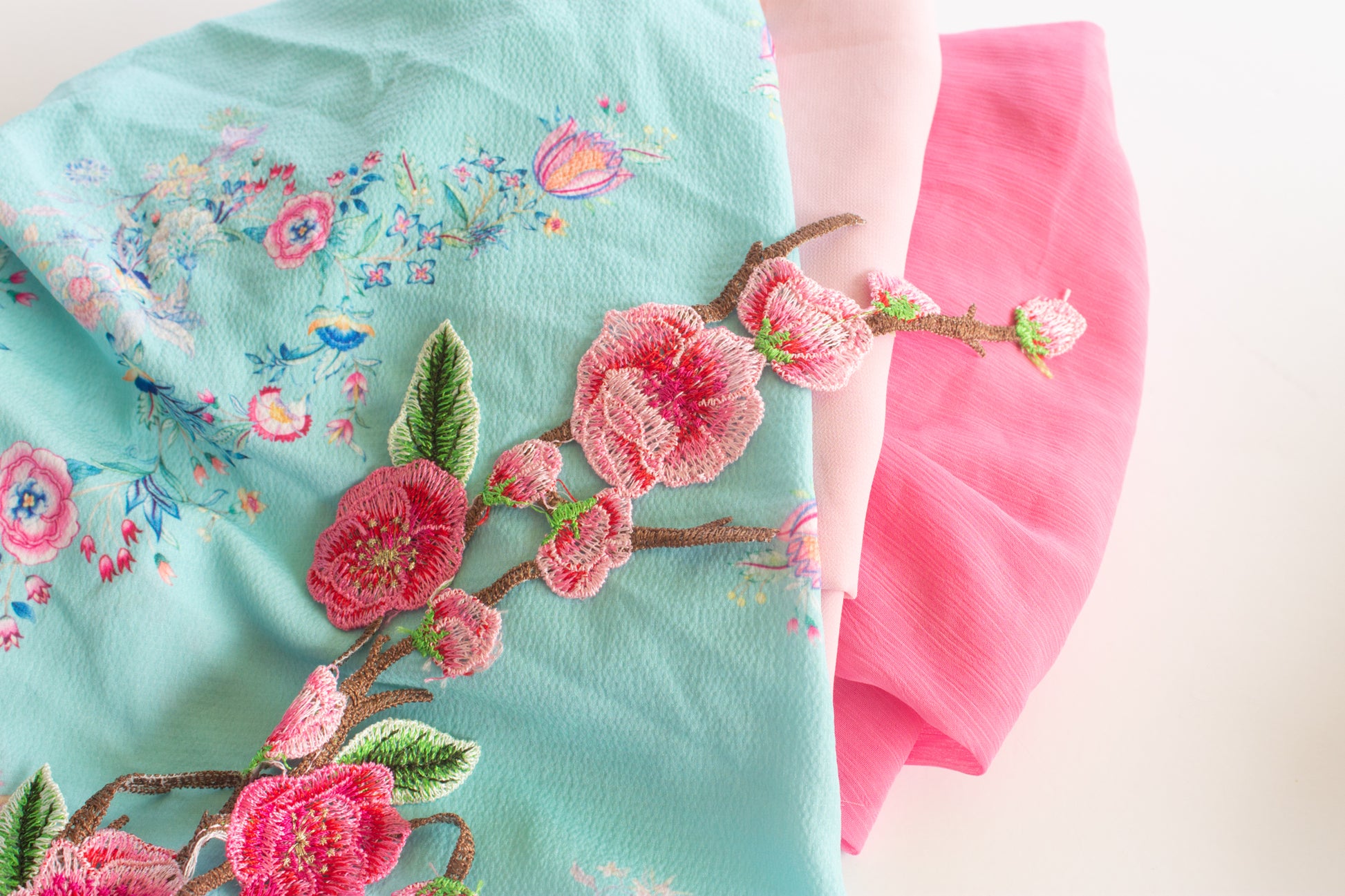 - Chiffon crepe layers in aqua vining floral, baby pink and bubble gum!
