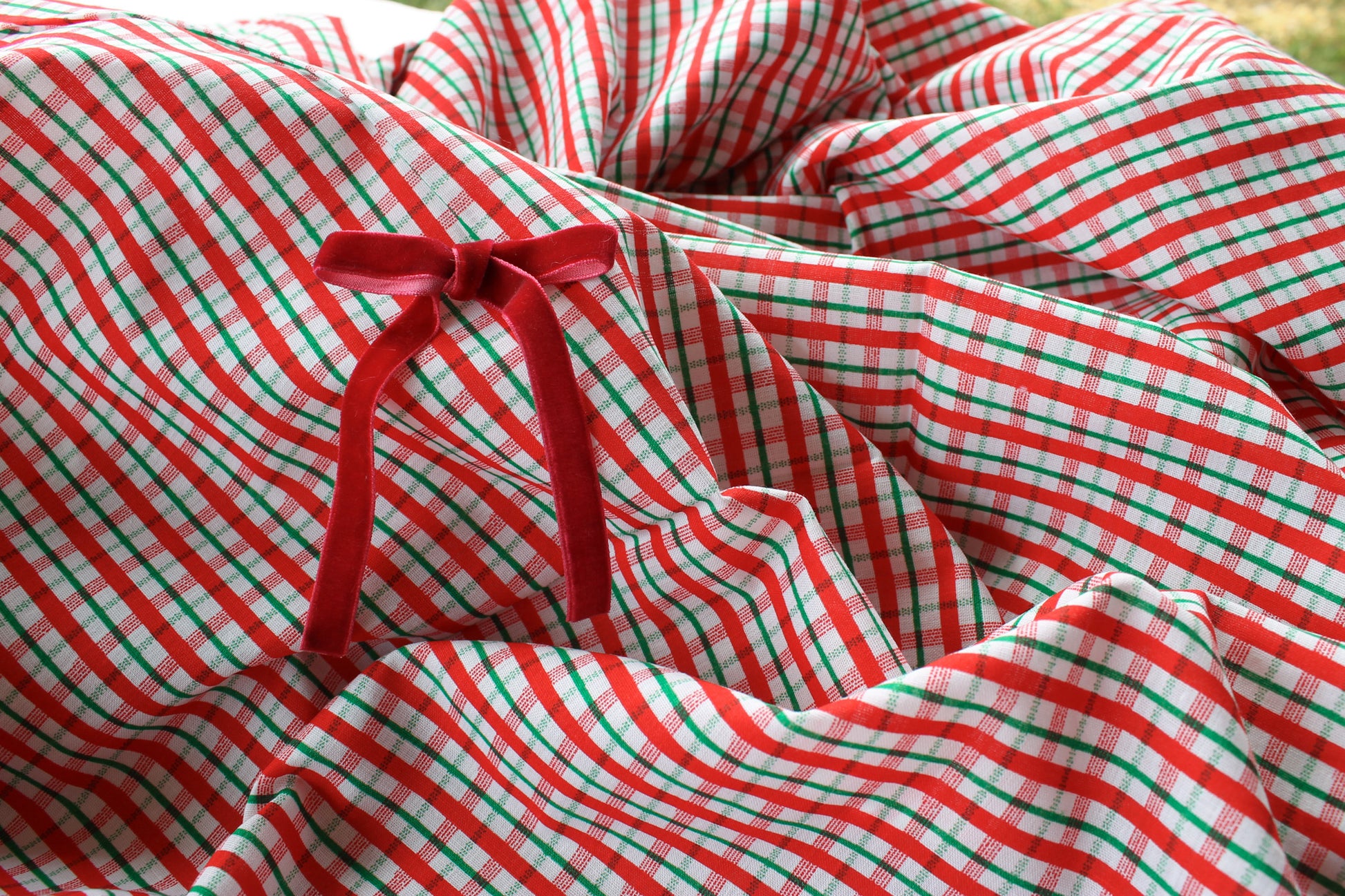 This custom dress will feature a vintage gingham print with traditional Christmas colors and red velvet ribbon accents, a unique dress for your one-of-a-kind girl!