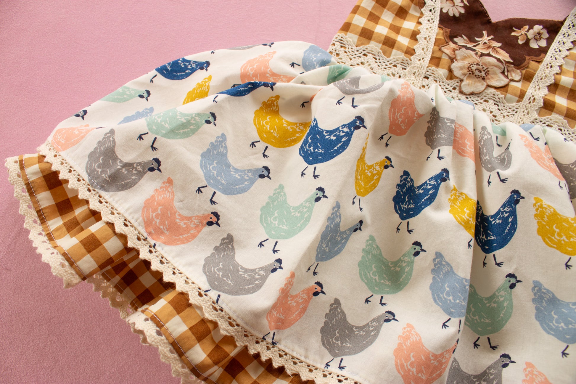 Dress your little one in this charming Cluck Cluck chicken dress, with delightful gingham and lace accents.