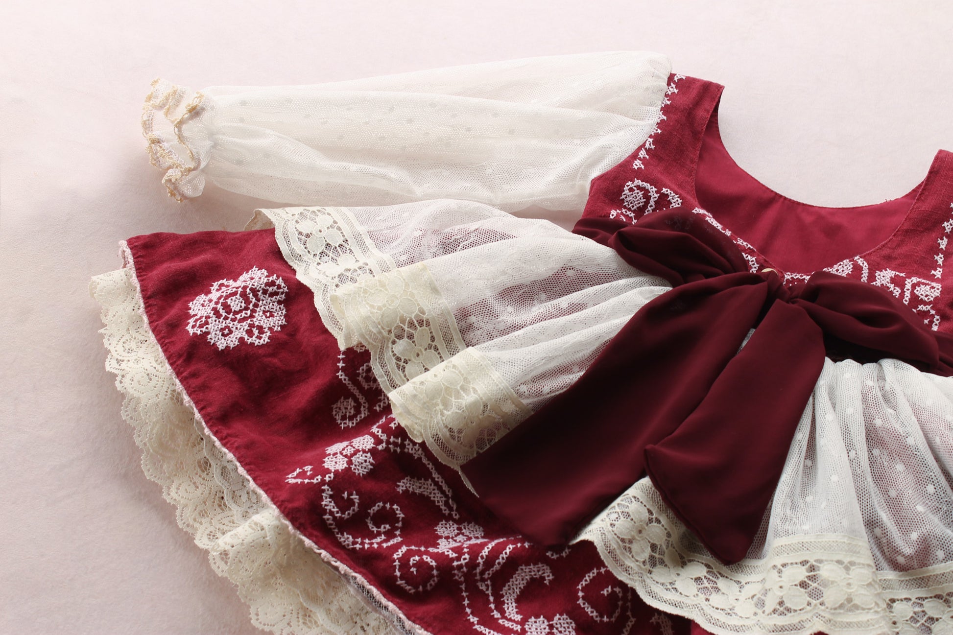 This custom dress will feature an upcycled burgundy tablecloth with embroidery for the bodice, burgundy skirt with lace overlay, a unique dress for your one-of-a-kind girl!