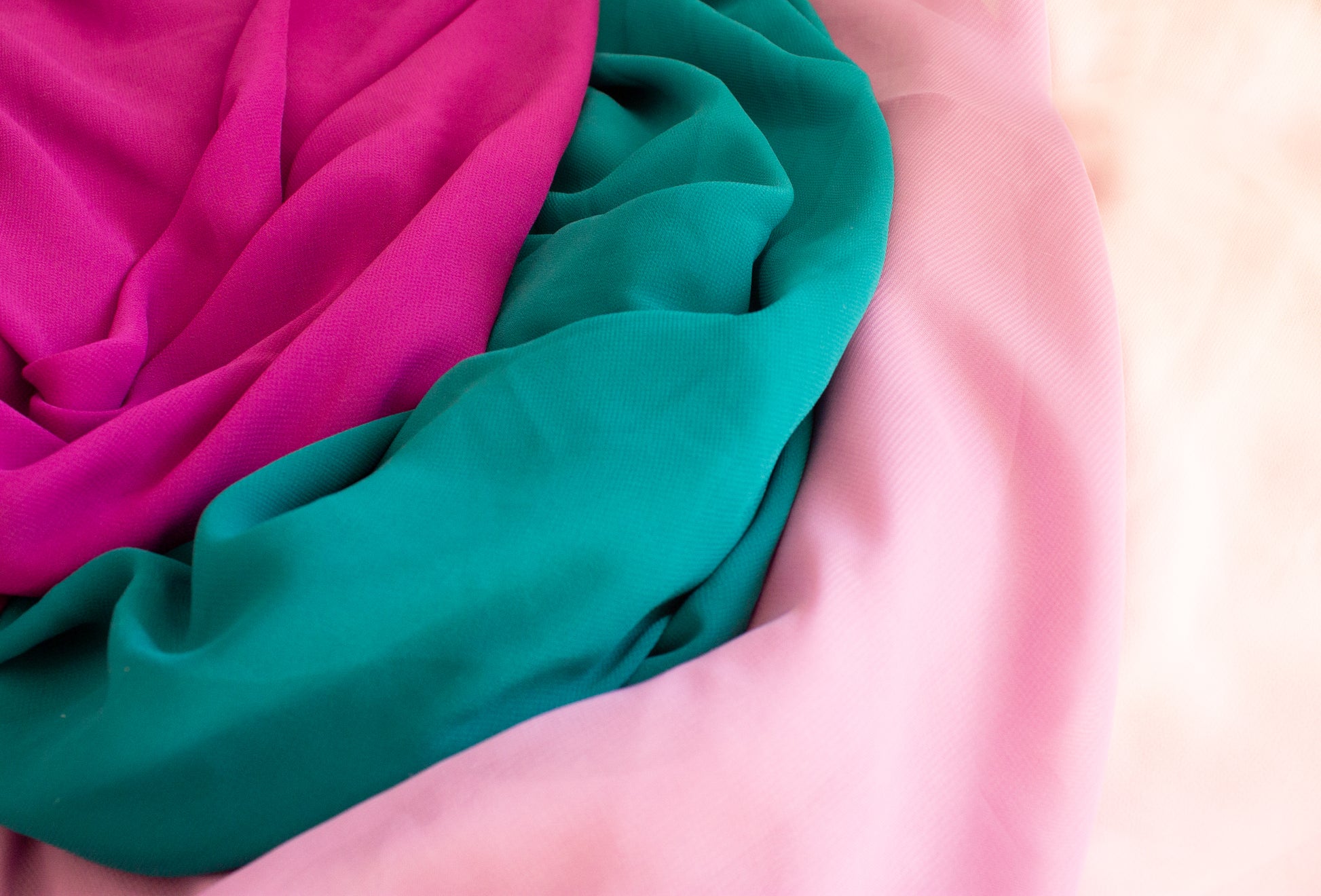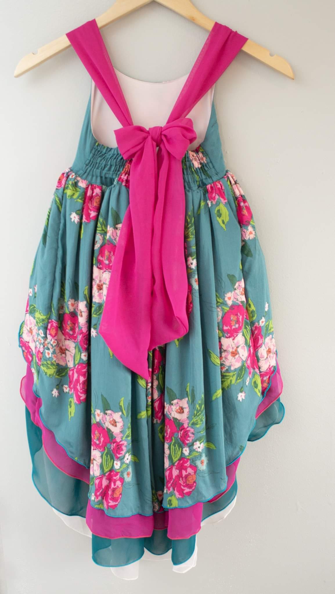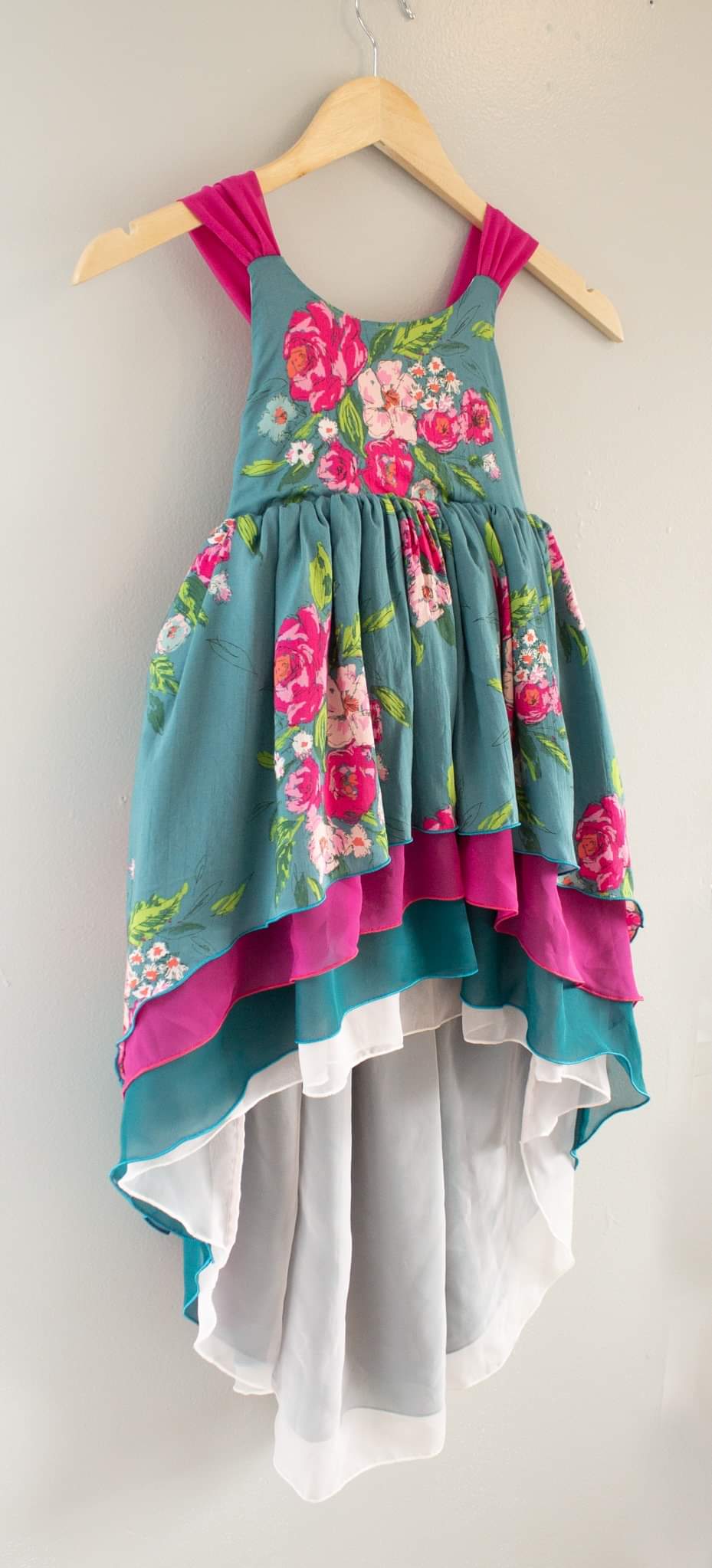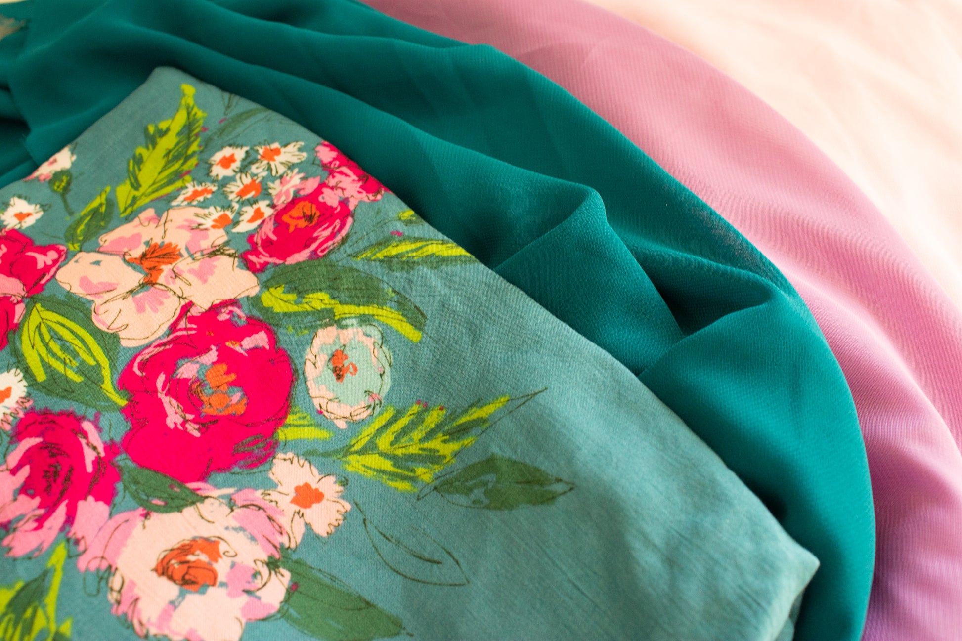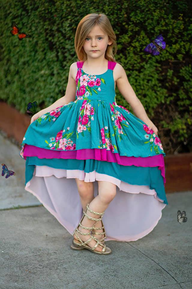 Teal Paradise features striking jewel tone floral print with hand drawn floral sprays, magenta pink, teal, orchid and soft pink chiffon layers.