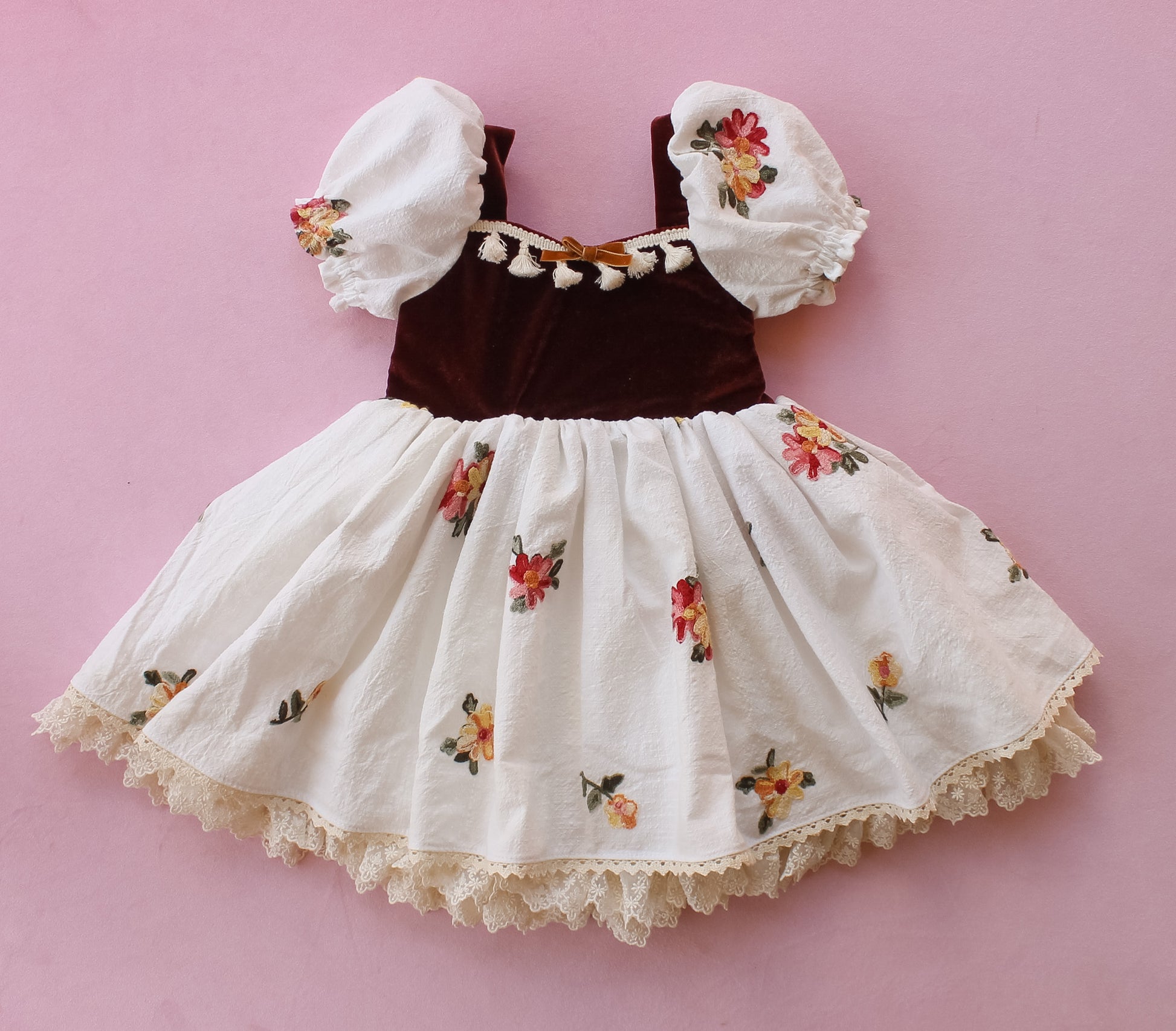 Indulge in the romantic beauty of Harvest, Our vintage materials are expertly crafted to showcase a striking floral print. The velvet bodice and puff sleeves add a touch of whimsy and elegance. Experience the magic of autumn in this one-of-a-kind statement piece, unique dress for your one-of-a-kind girl!