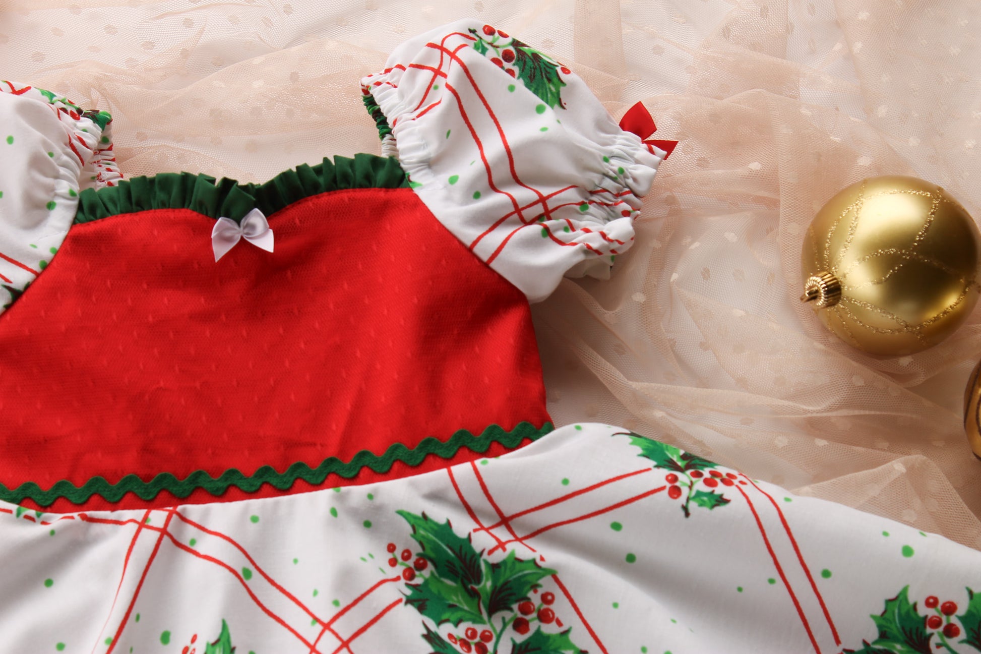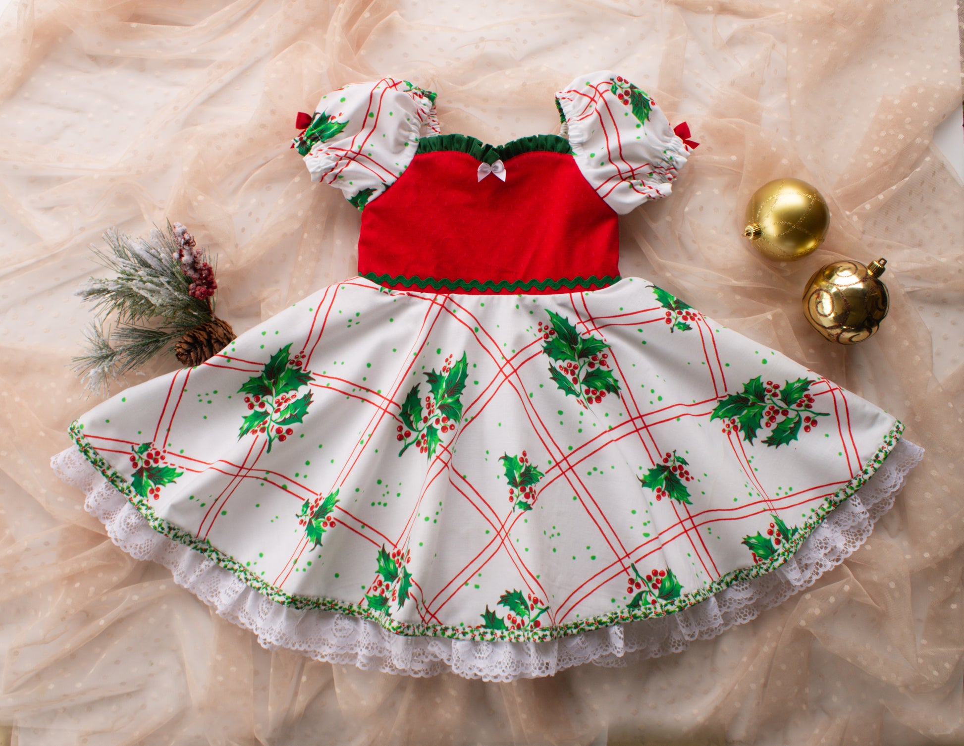 This custom dress will feature a vintage print with wide spaced gingham and holly berry sprays, red velvet ribbon, a unique dress for your one-of-a-kind girl!