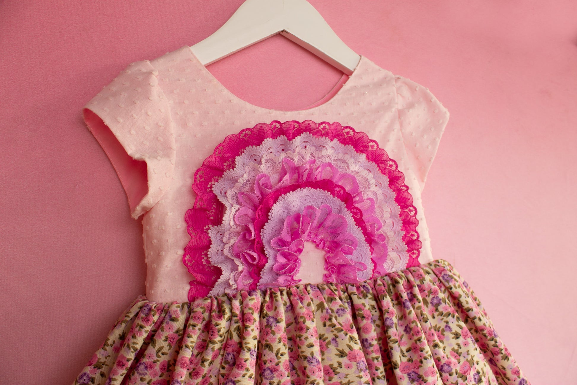Expertly crafted, the Blossom Rainbow dress features a vintage floral design with a delicate pink Swiss dot bodice. The dress is complemented by a vintage lace rainbow, adding a touch of elegance to this charming piece. A timeless addition to any wardrobe.