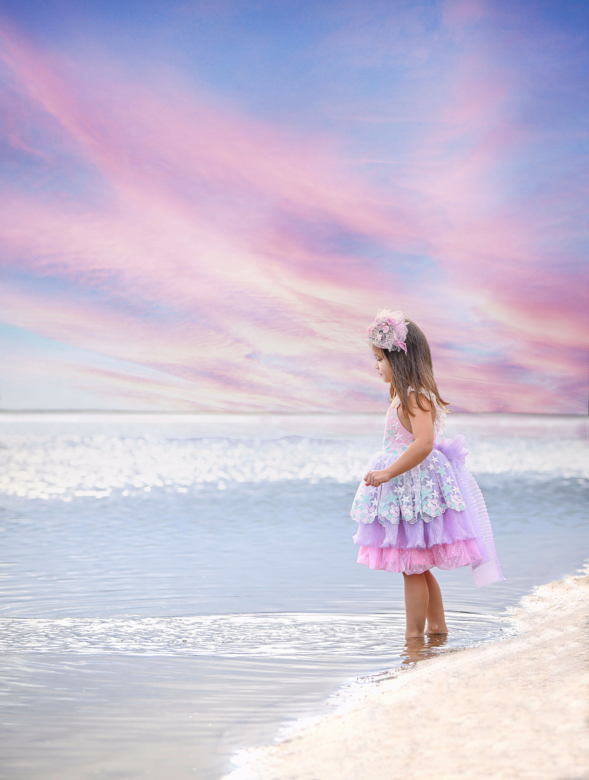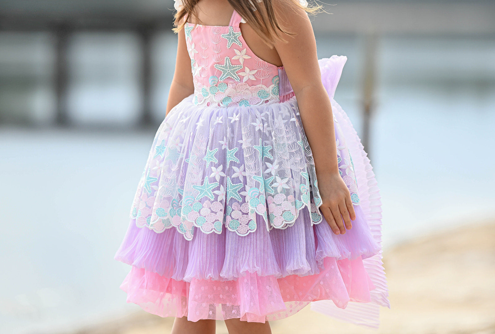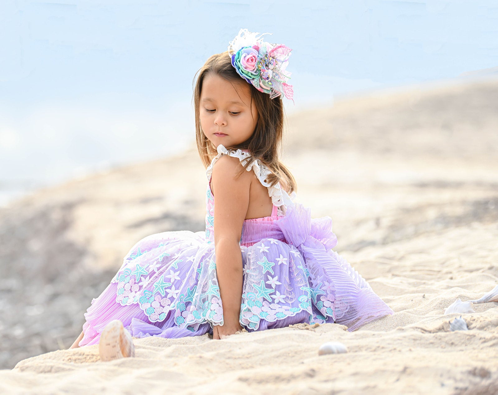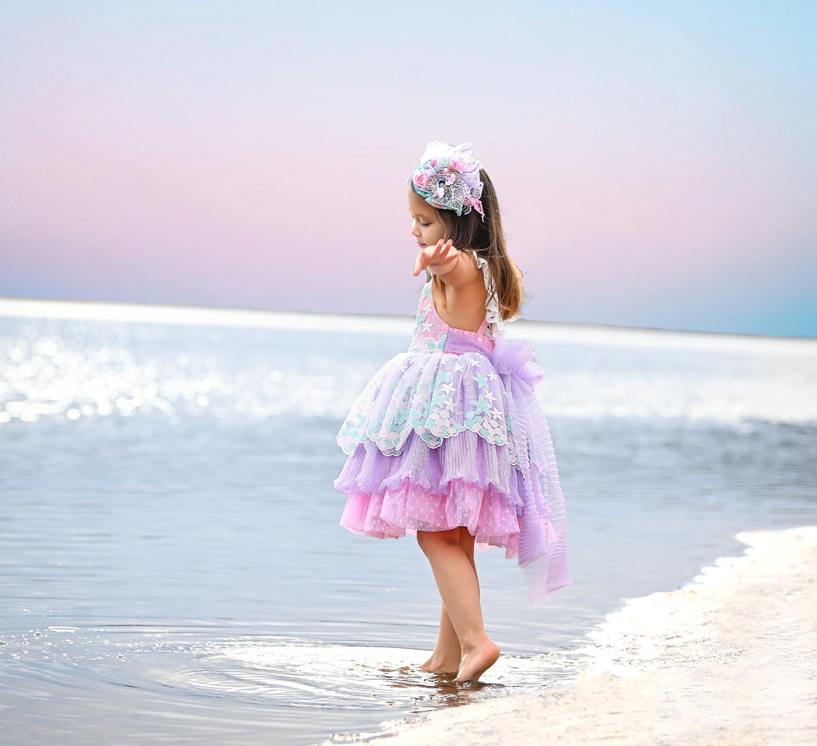 Indulge in the ethereal beauty of Mira mermaid dress. Flowy pink and purple layers with delicate embroidered lace, evoking the mystical sea. Perfect for bringing the magic of the ocean to any occasion.