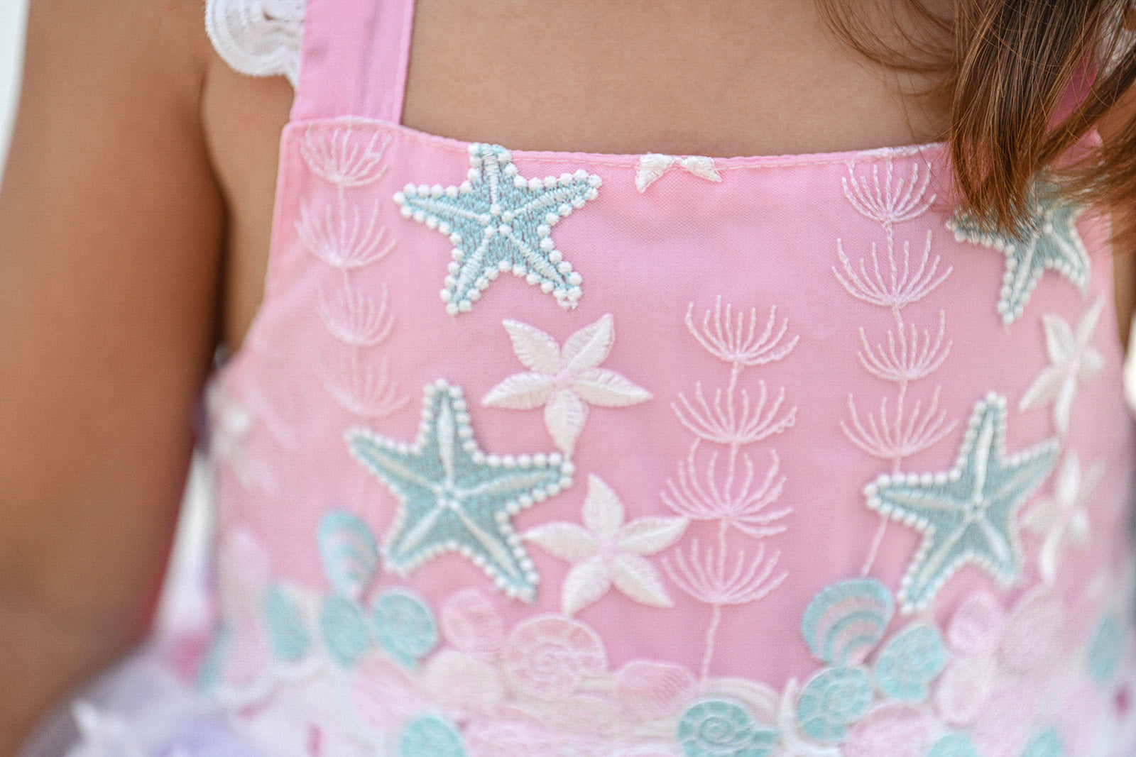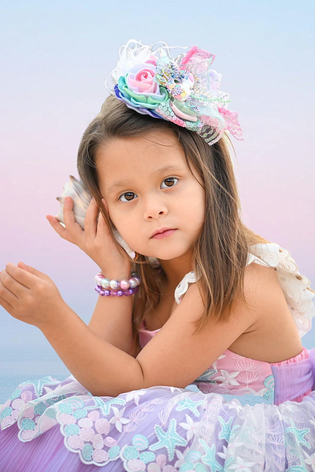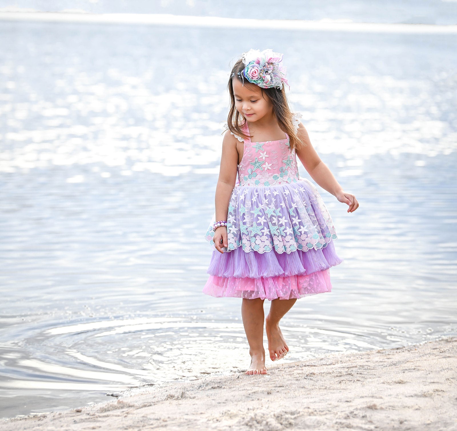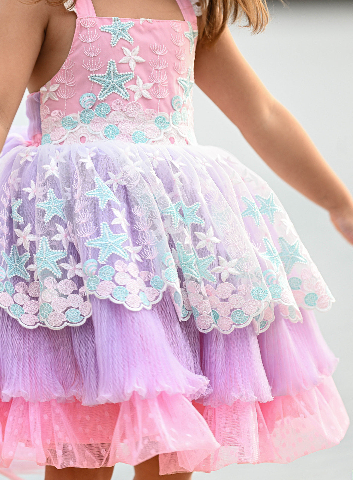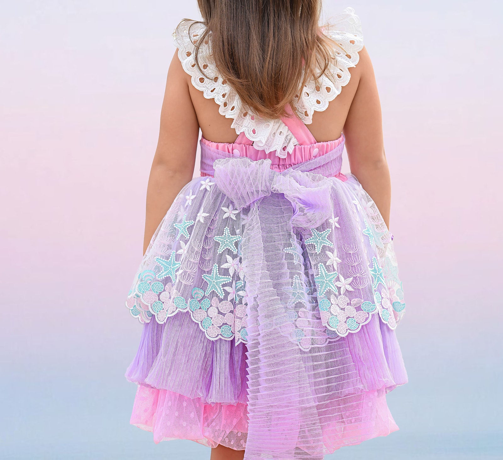 Indulge in the ethereal beauty of Mira mermaid dress. Flowy pink and purple layers with delicate embroidered lace, evoking the mystical sea. Perfect for bringing the magic of the ocean to any occasion.