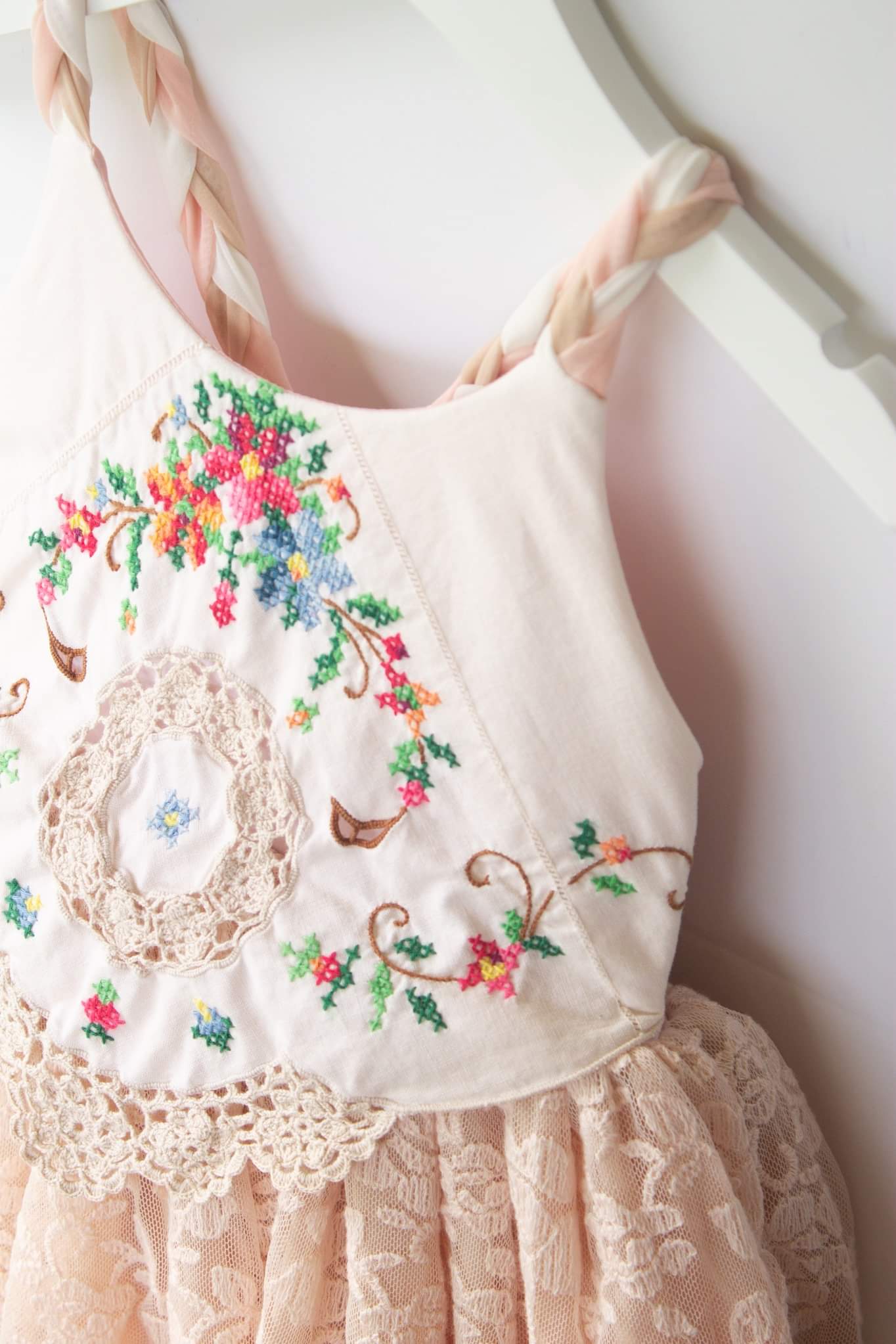 Vintage lace in a soft pink, Upcycled vintage embroidered tablecloth bodice and all the laces your heart could desire!