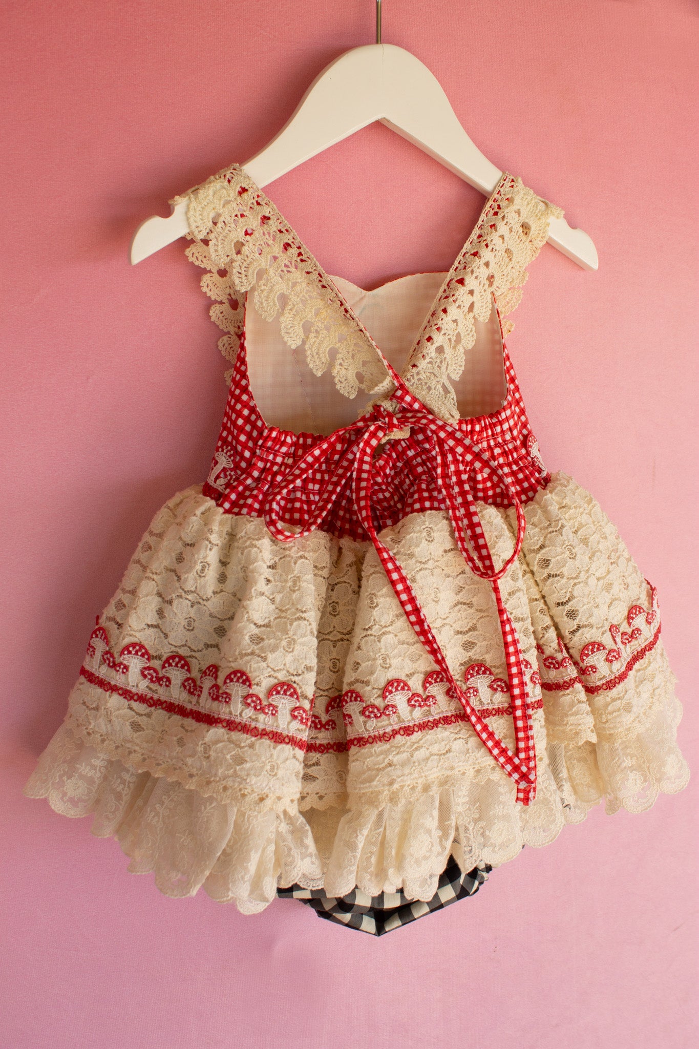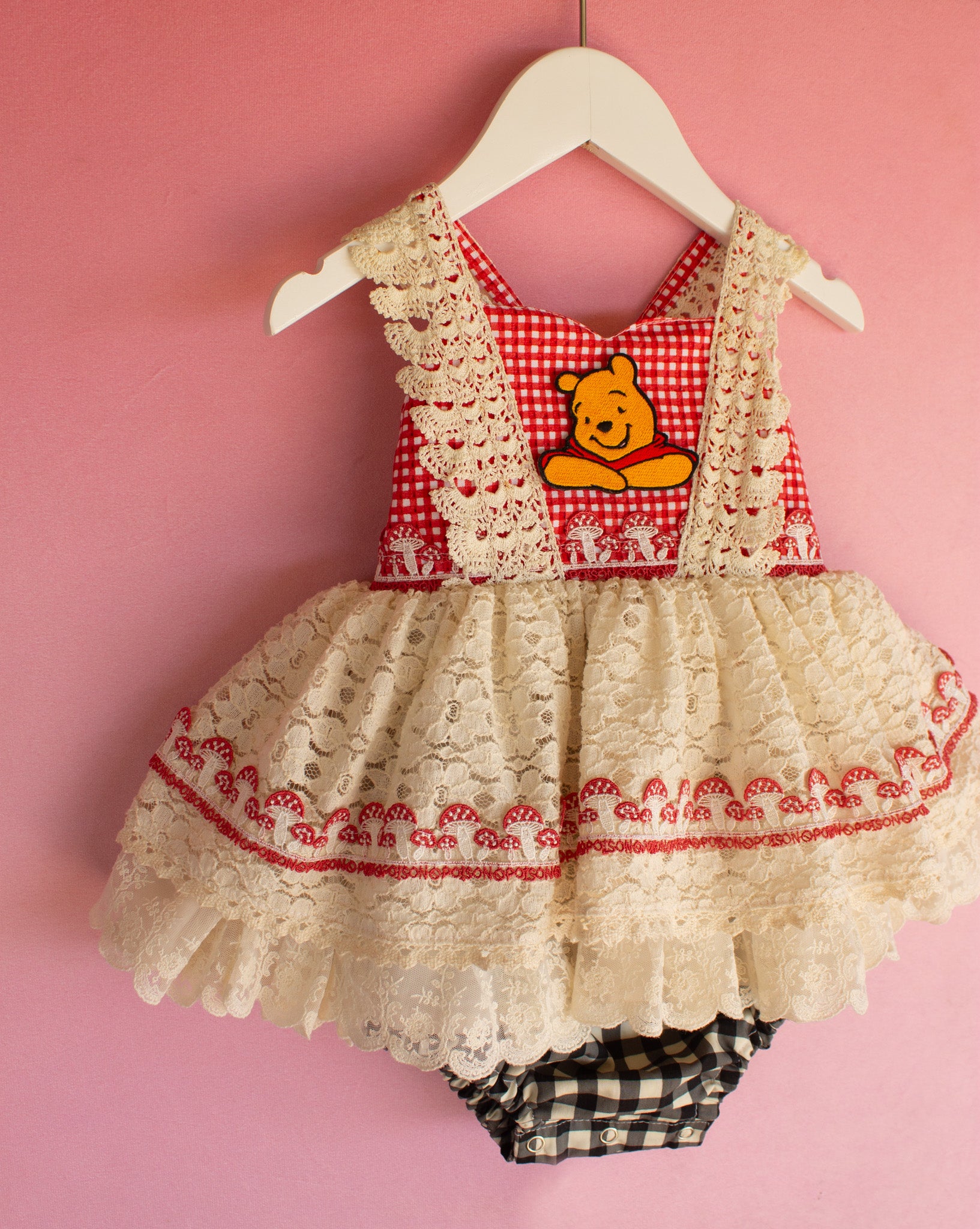Transform your little one into an adorable pooh bear with our Oh Bother bubble! The unique mushroom trim adds a whimsical touch to the vintage lace skirt and timeless gingham fabric. Perfect for ages 18-24 months.