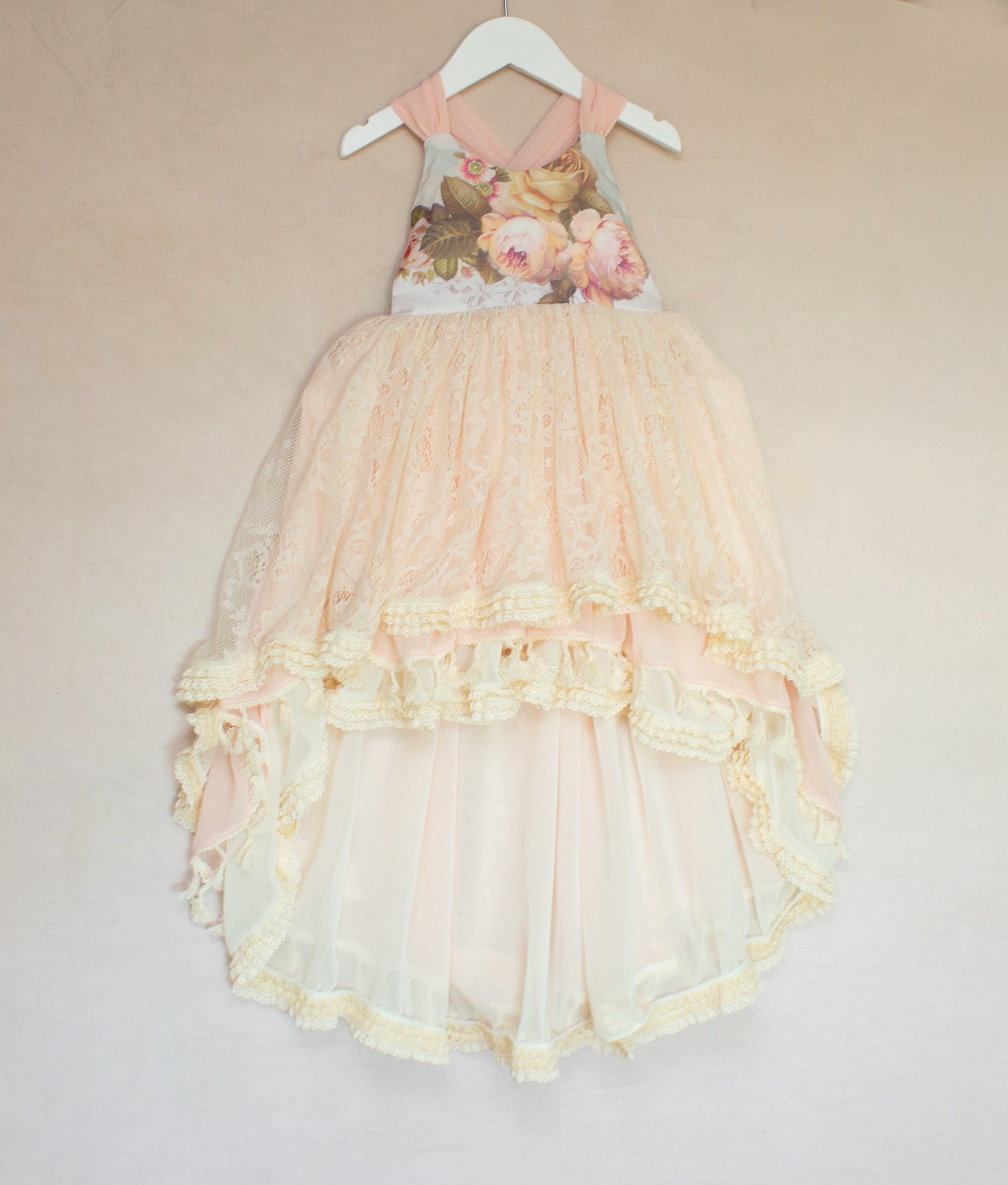 Beautiful floral Bouquet is the center piece of this stunning hi-low, vintage trims and lace overlay, finished with layers of ivory and blush pink, lined for comfort - This dress is truly like no other!