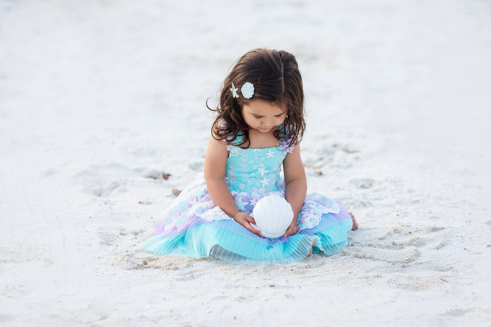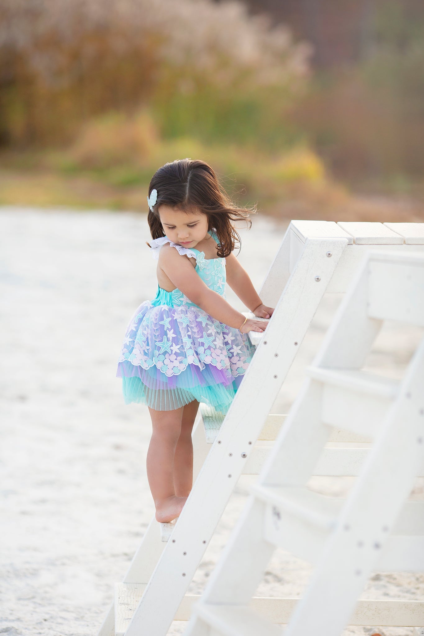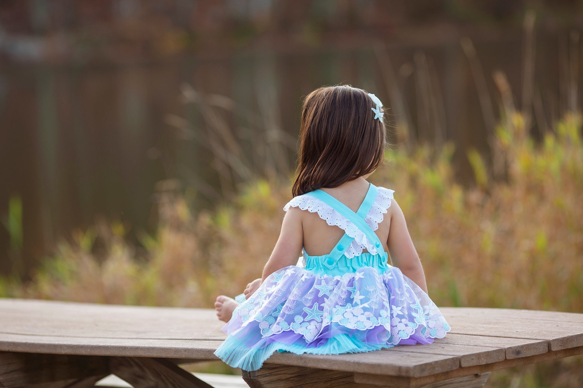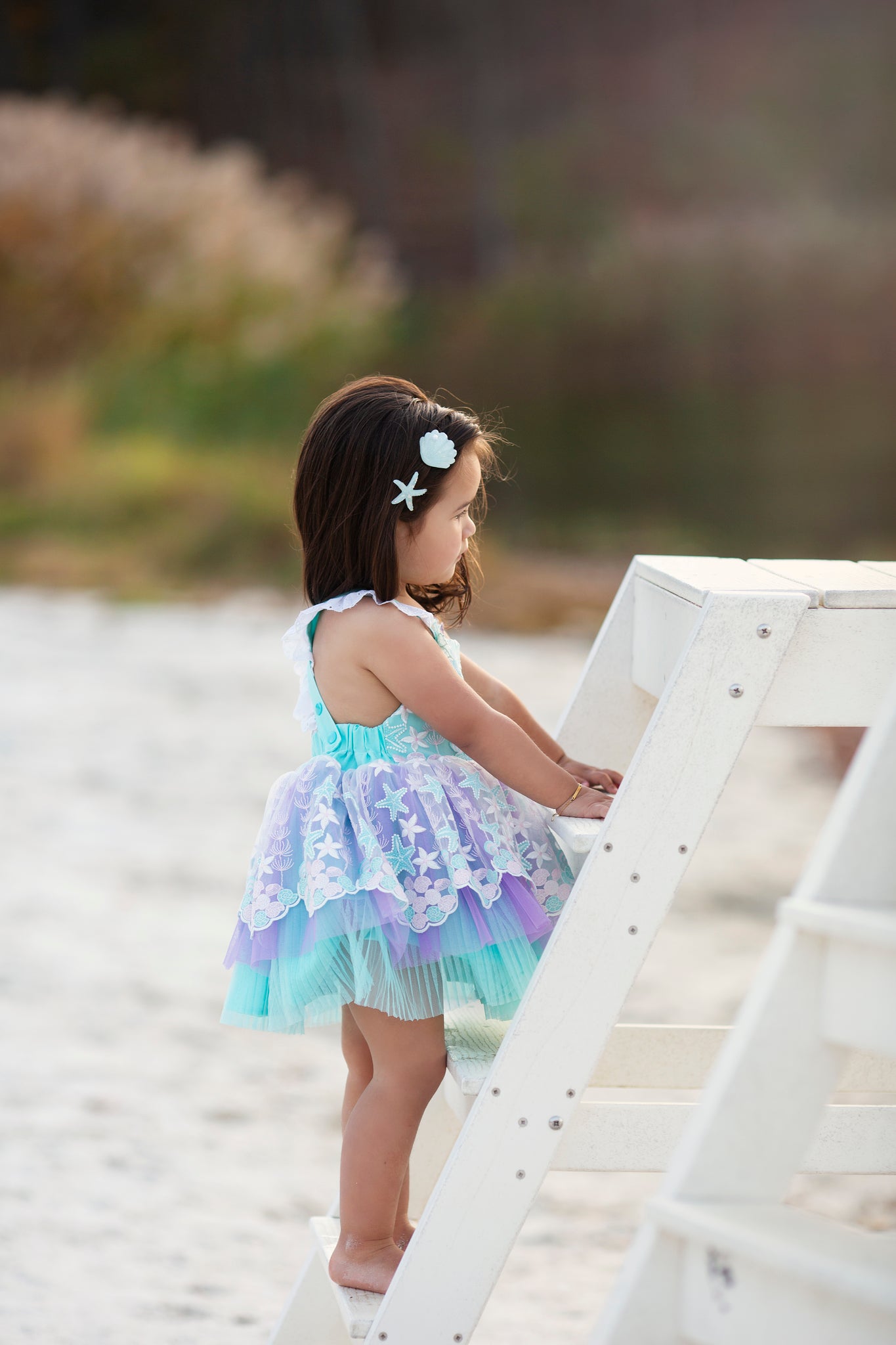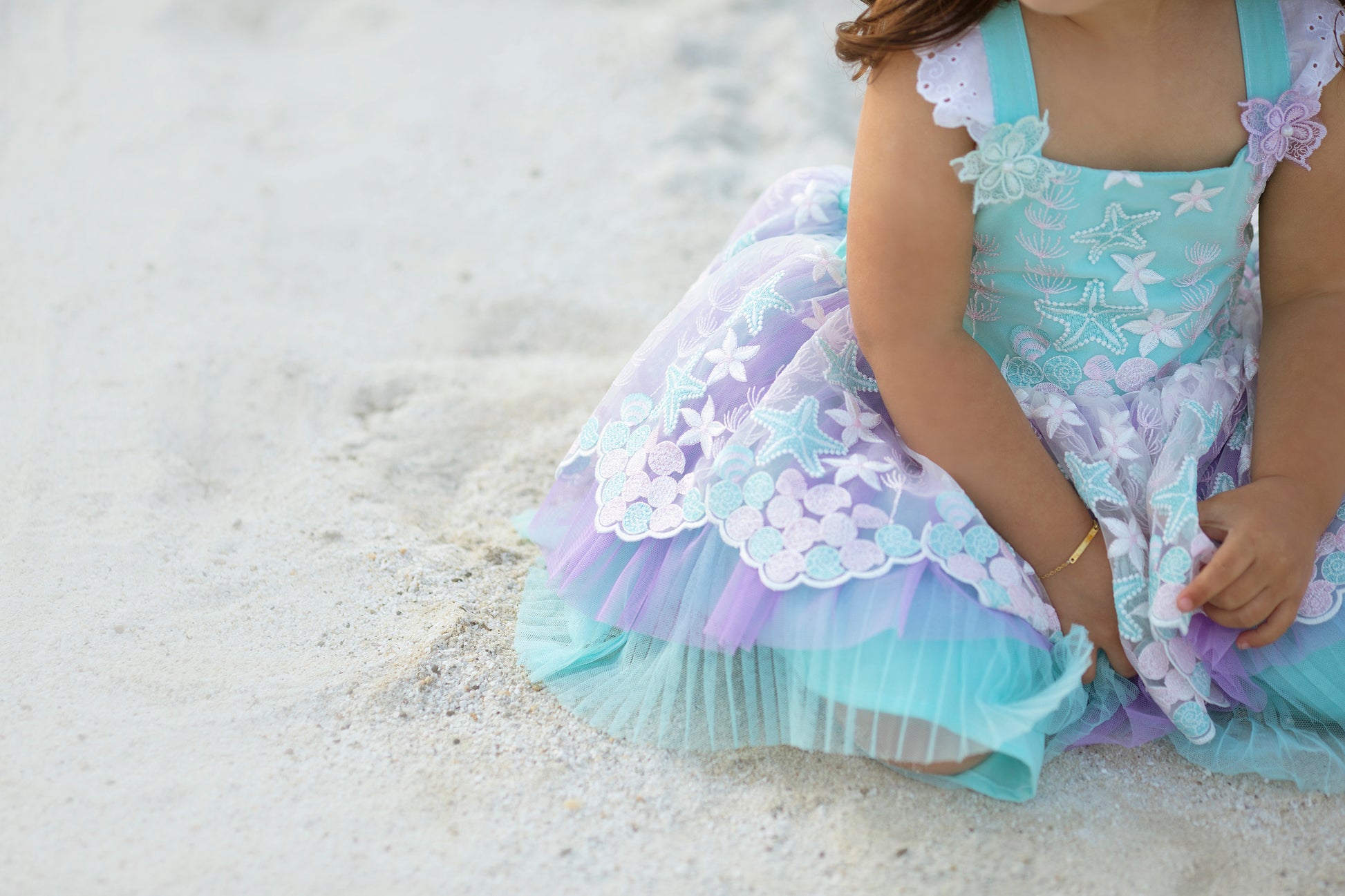 Embroidered starfish and shell lace is the crowning glory on the bodice and top skirt; layered with incredibly soft mesh she could sleep in, elastic back for a flexible fit and adjustable eyelet trimmed straps, it's the sweetest addition to your mermaid's closet!