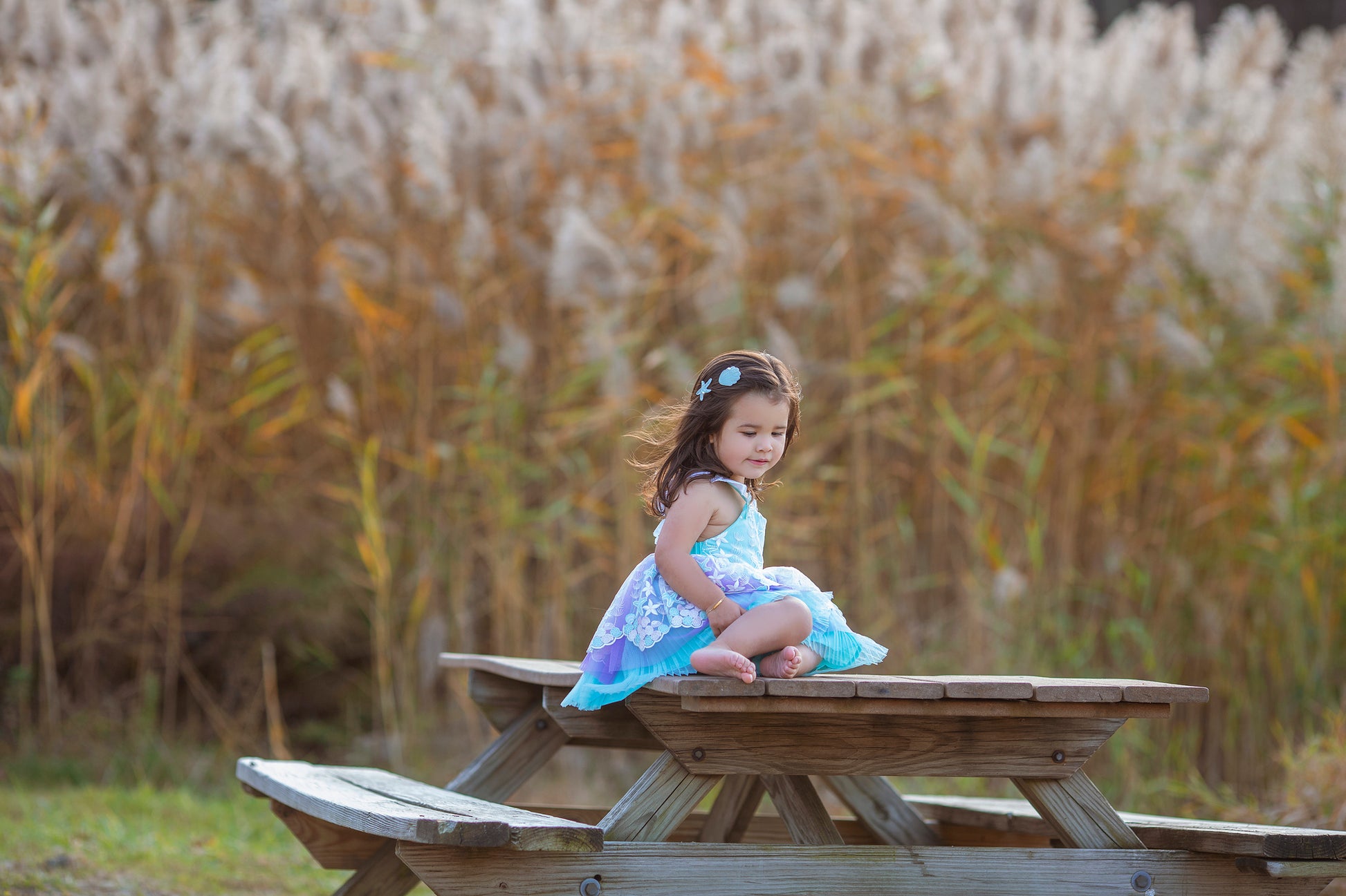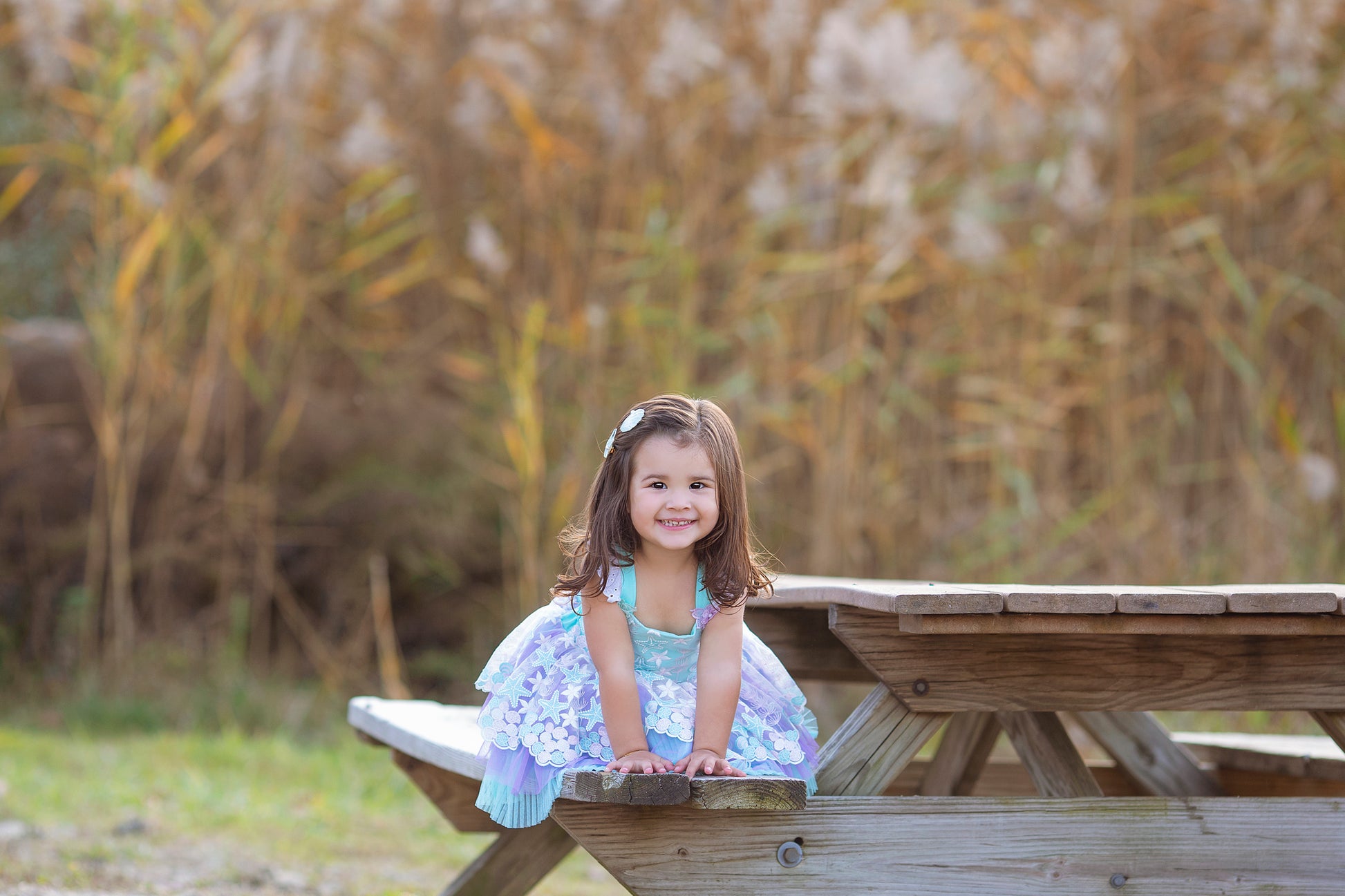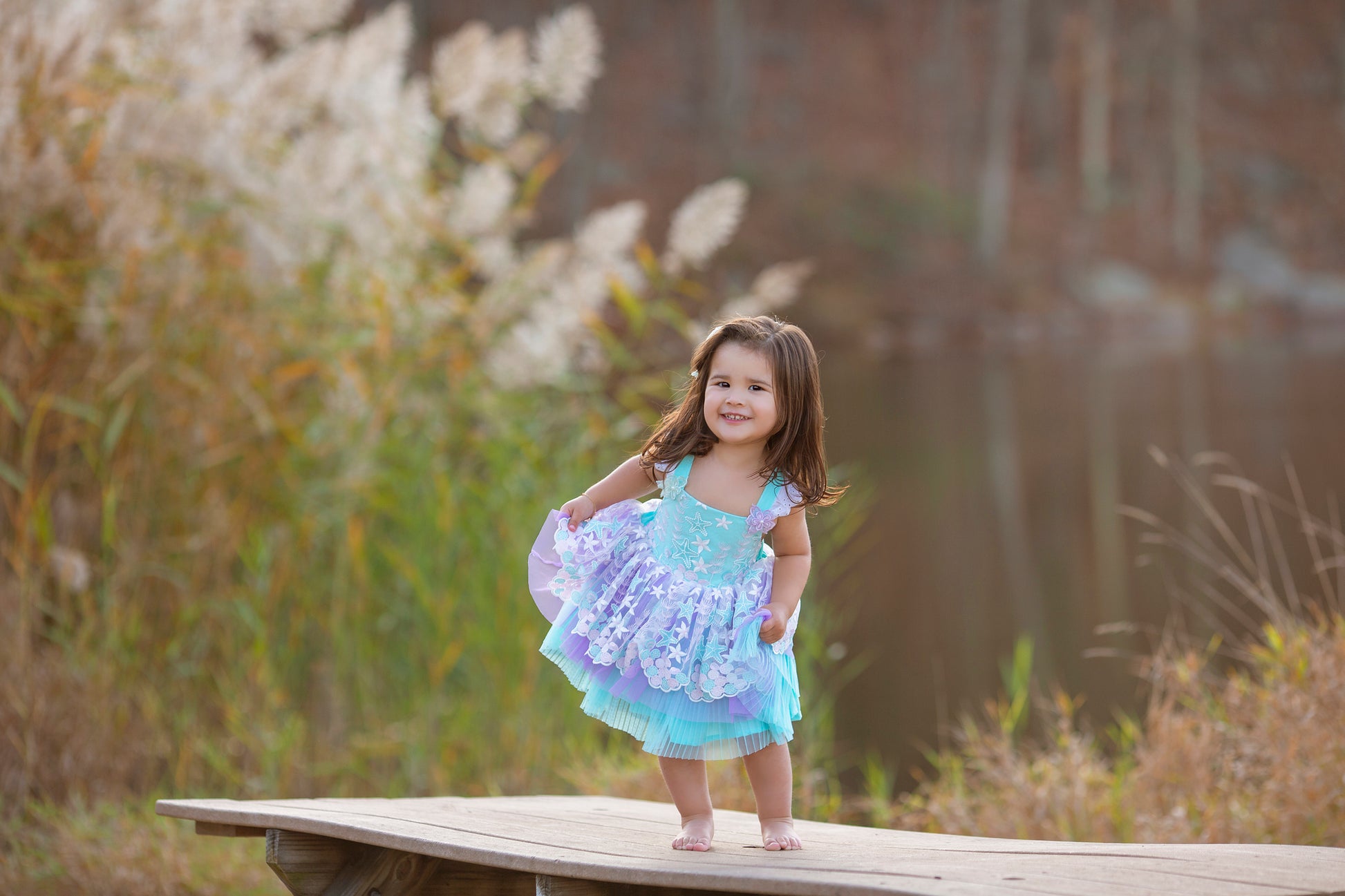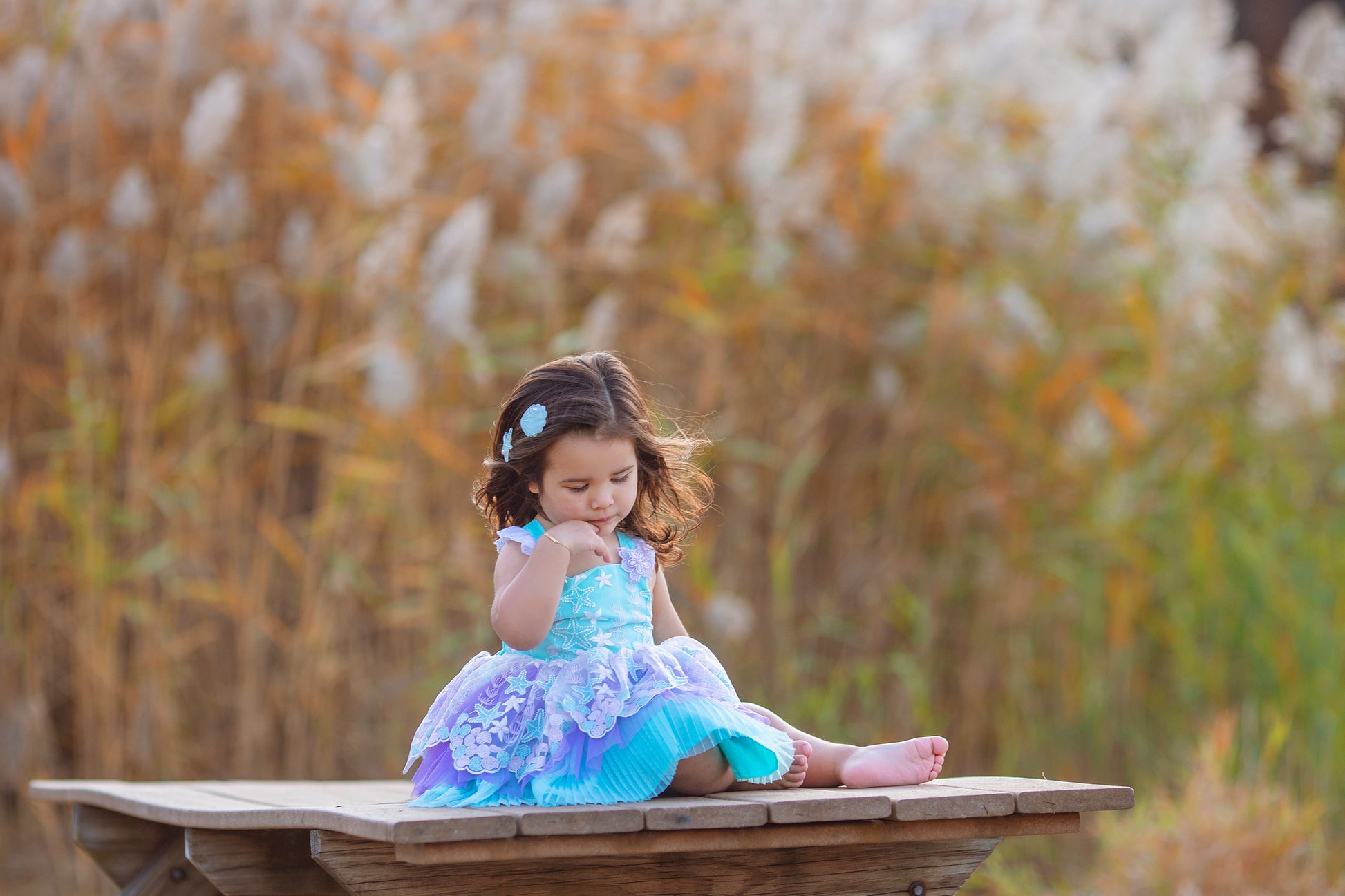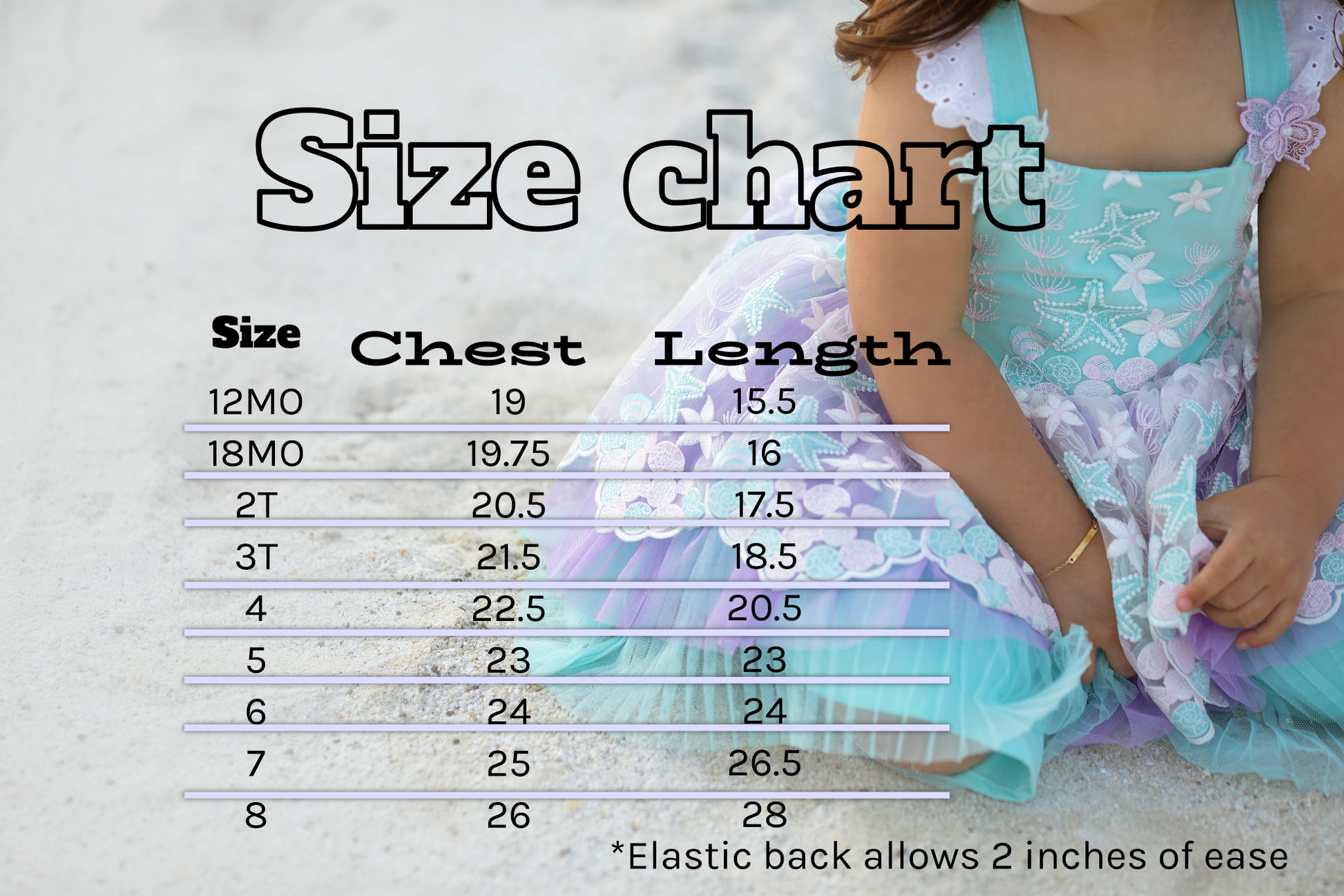 Embroidered starfish and shell lace is the crowning glory on the bodice and top skirt; layered with incredibly soft mesh she could sleep in, elastic back for a flexible fit and adjustable eyelet trimmed straps, it's the sweetest addition to your mermaid's closet!
