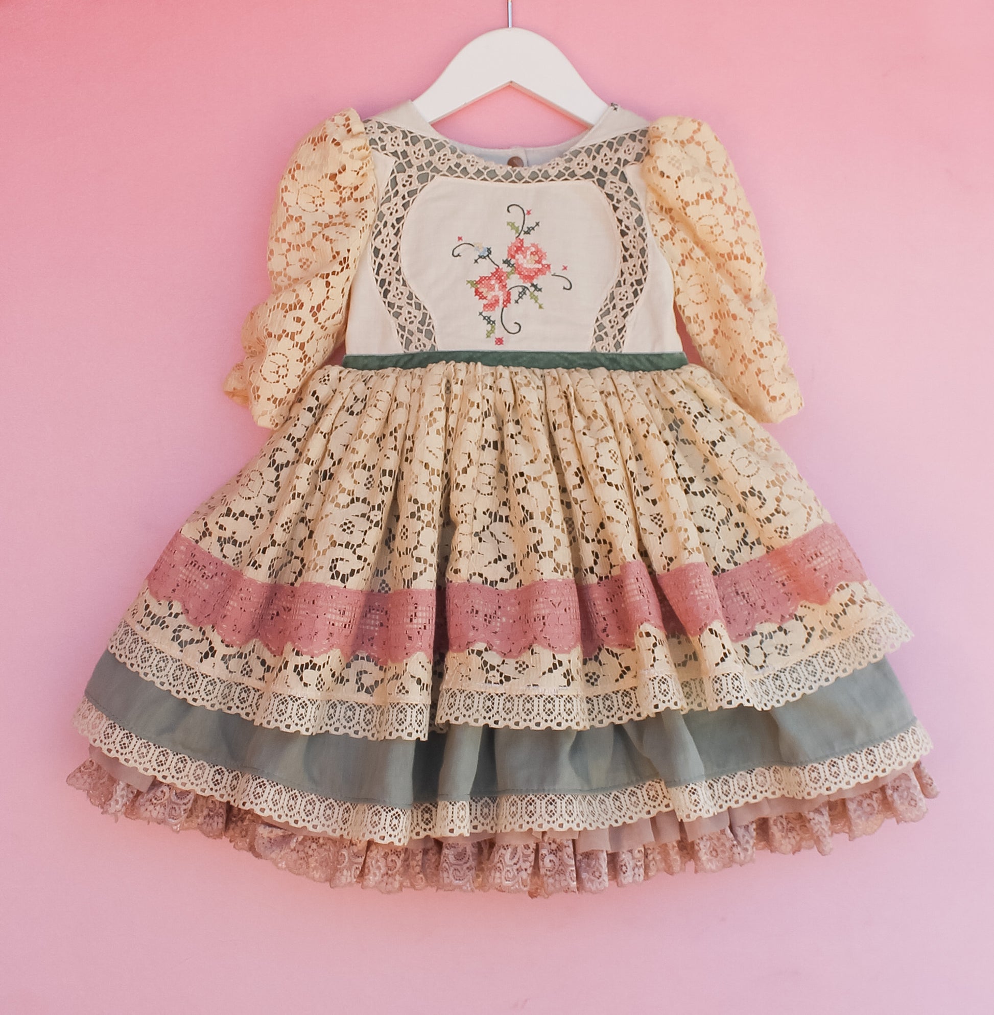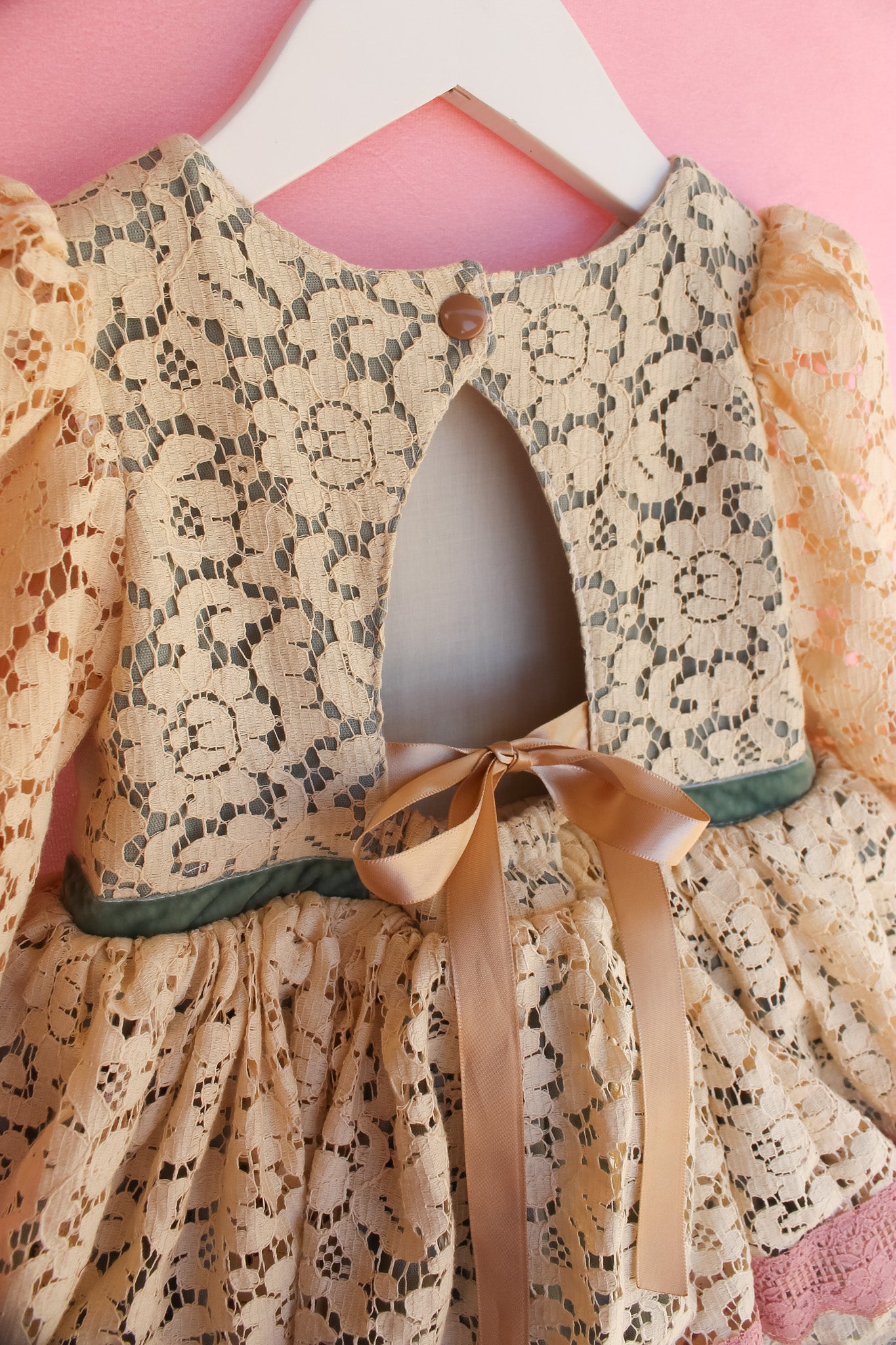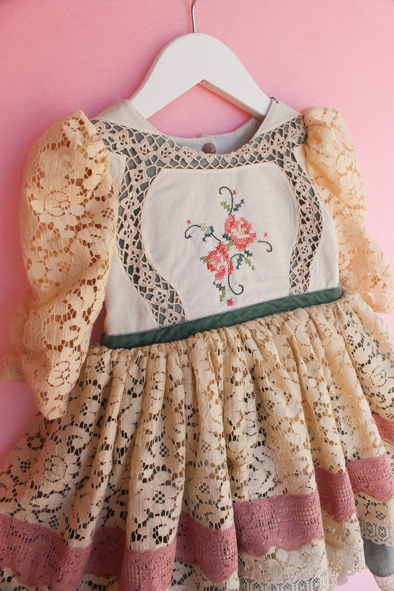 Have her ready for any adventure in this sweet rose dress, made from a carefully curated collection of vintage lace, paired with a modern floral, combining the best of the old with new!
