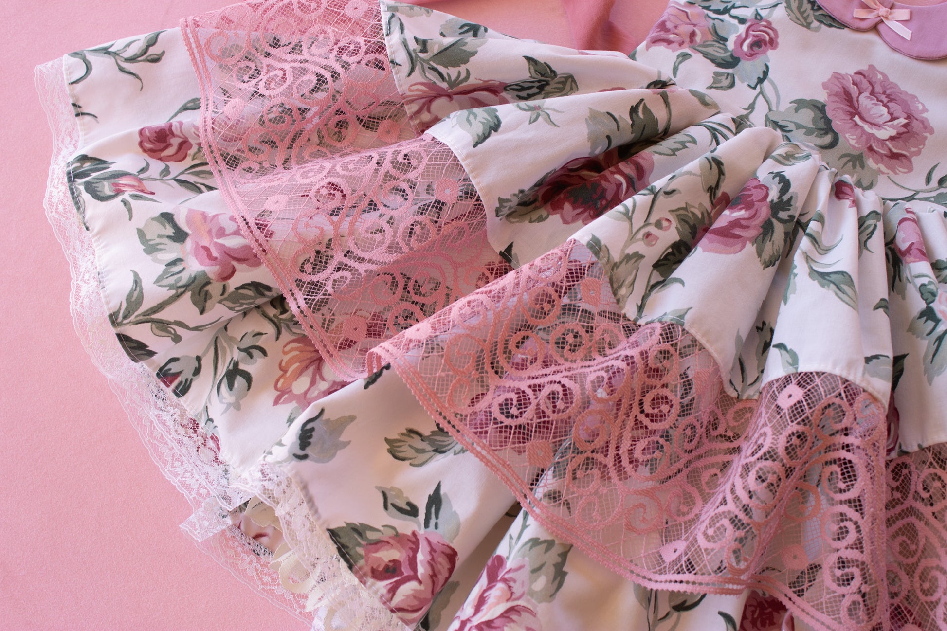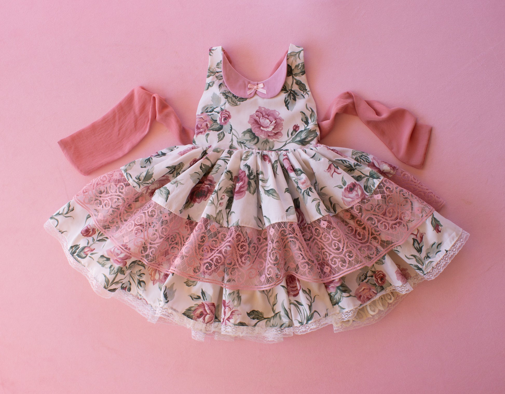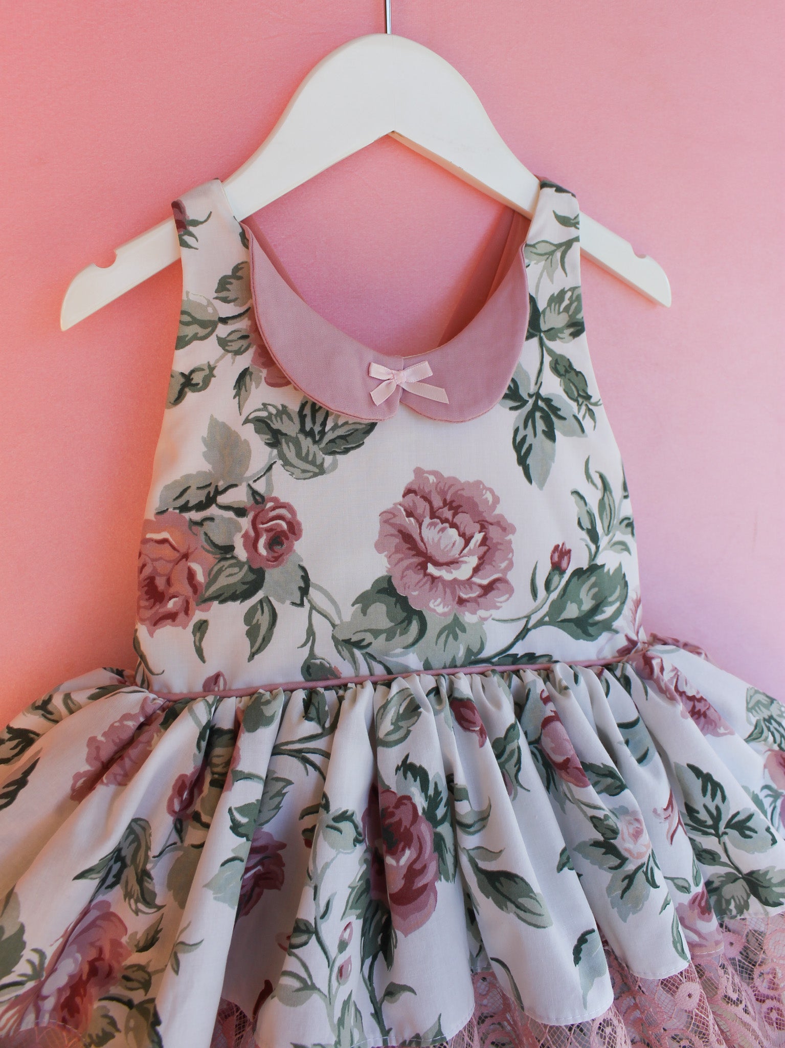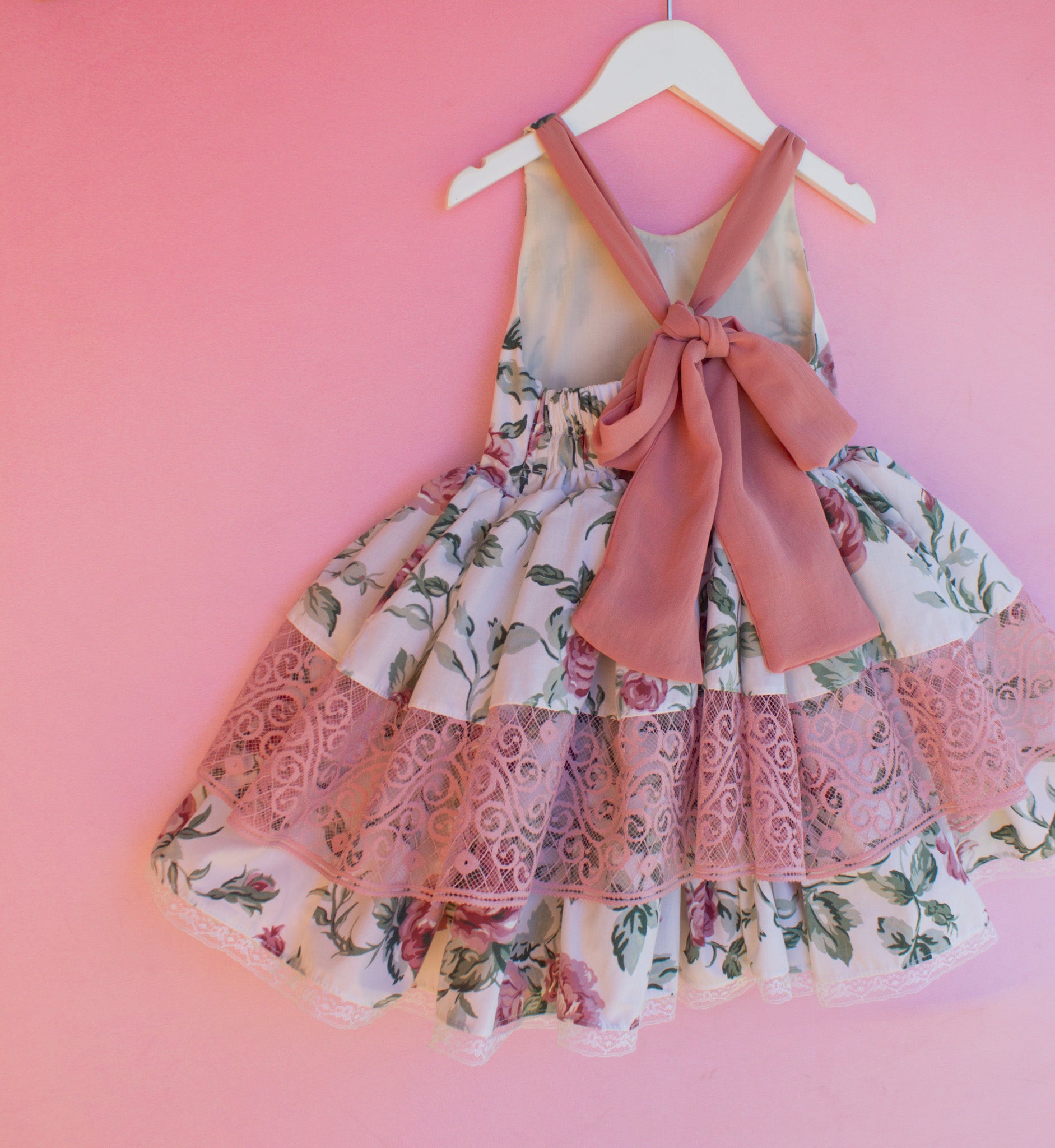 Have her ready for any adventure in this sweet rose dress, made from a carefully curated collection of vintage lace, paired with a modern floral, combining the best of the old with new!