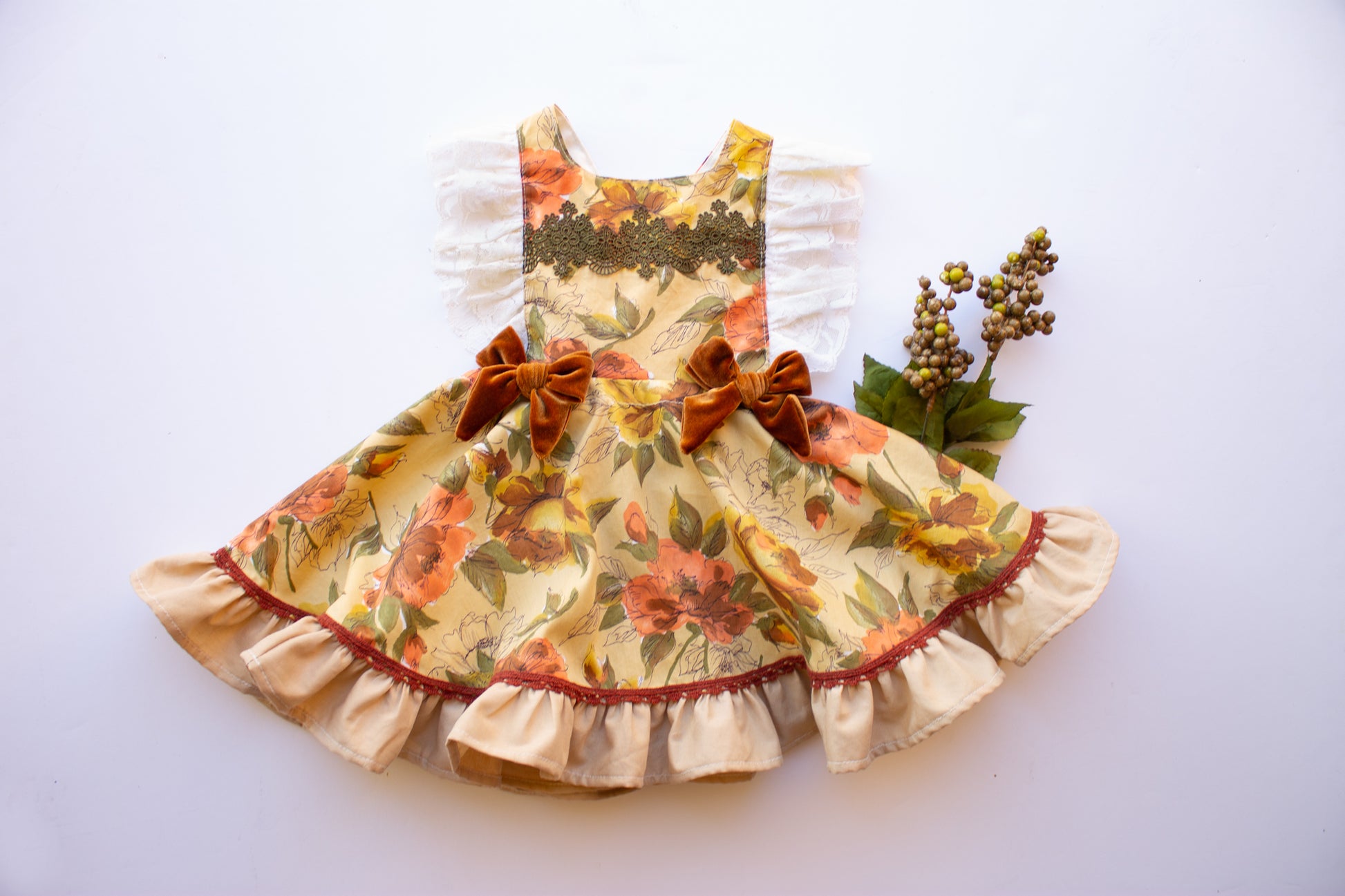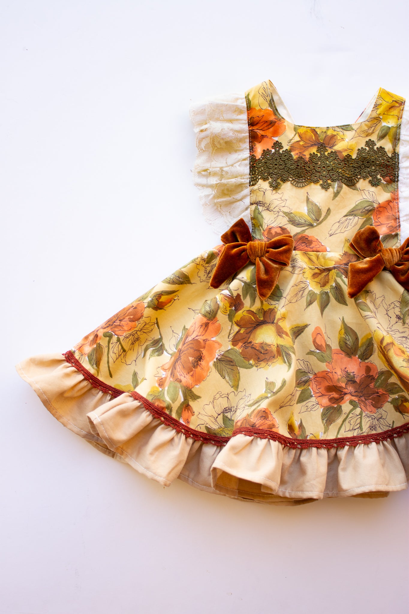 vintage and gorgeous bodice details, layered with stunning olive lace across the bodice, tan ruffles and vintage cinnamon color trim along the skirt hem.
