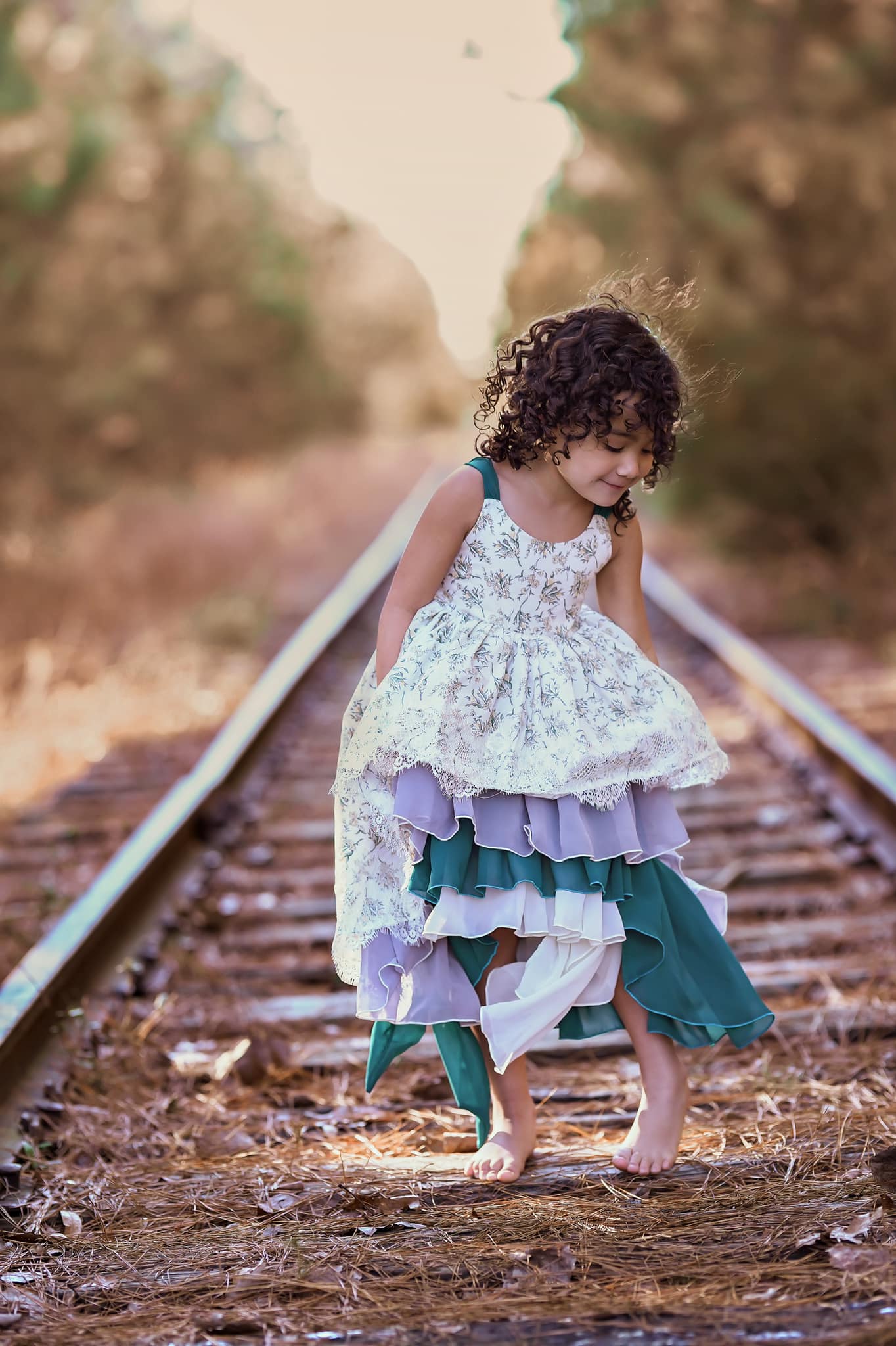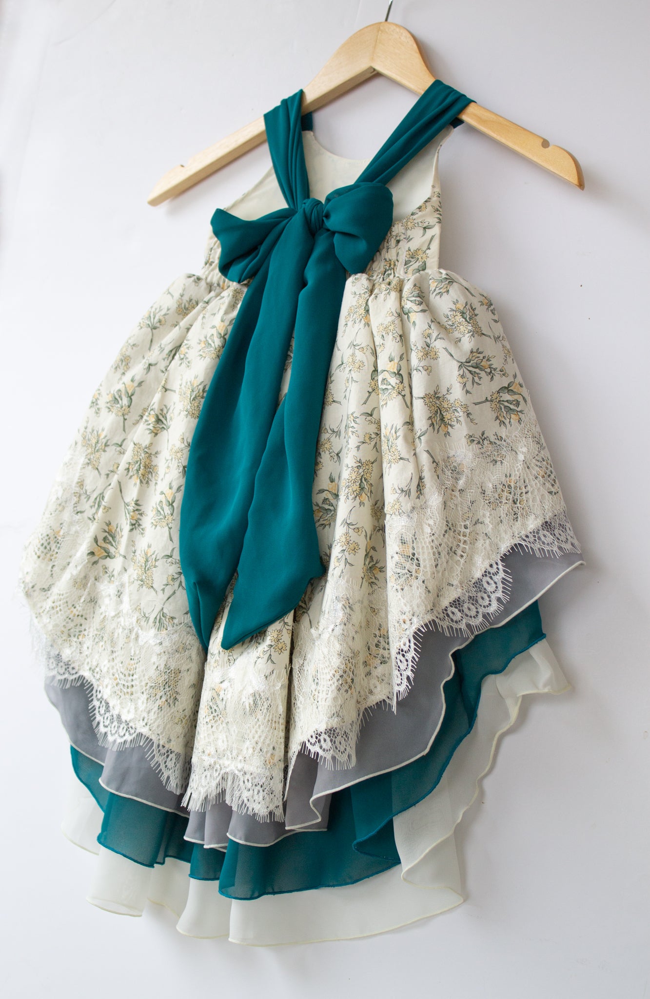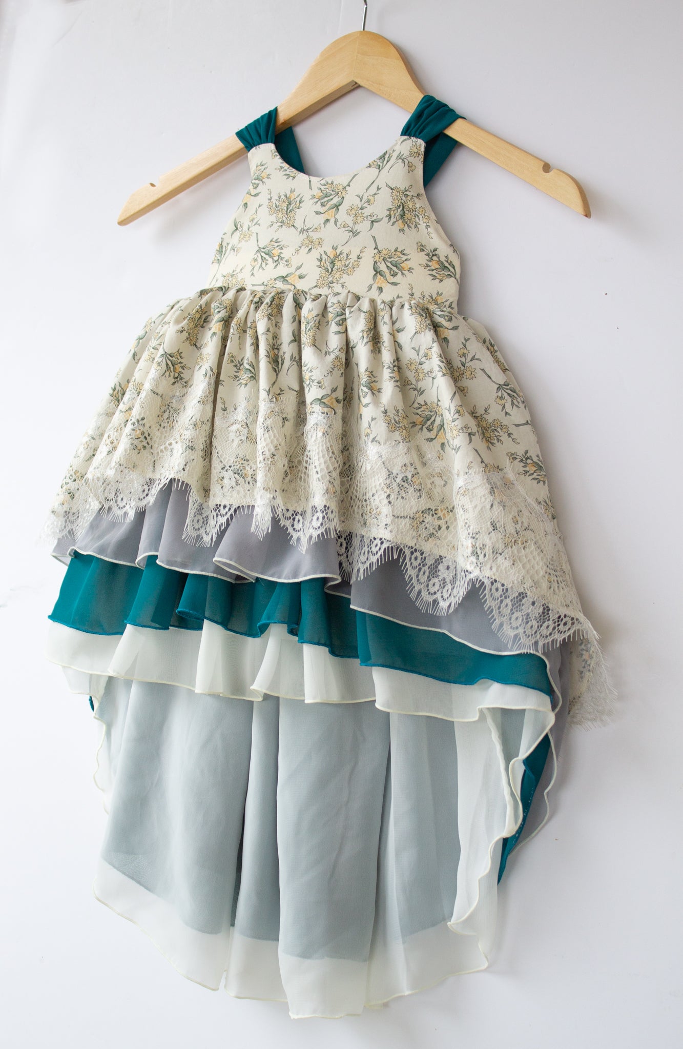 Silver dove features gorgeous layers of chiffon in buttercream ivory, teal and silver with a delicate floral print with buttercream rose sprays.