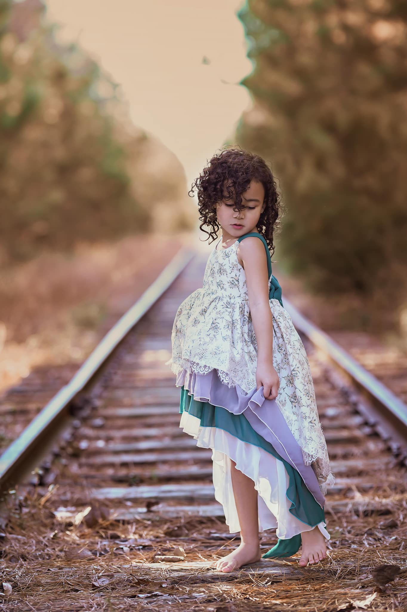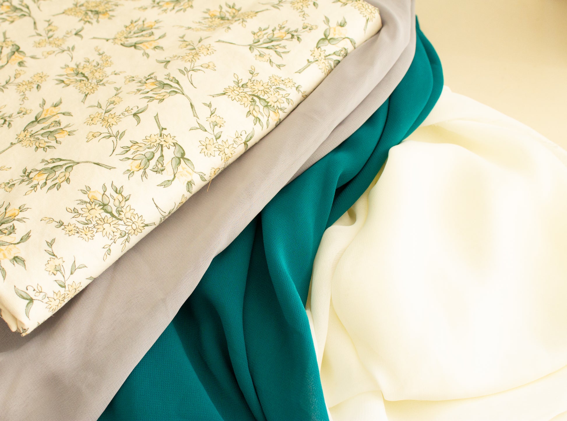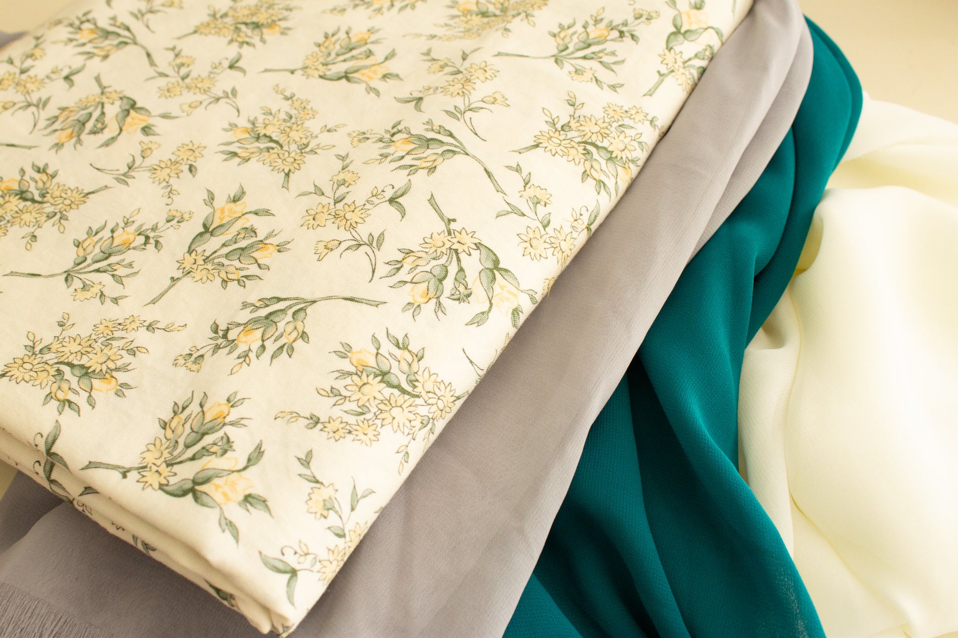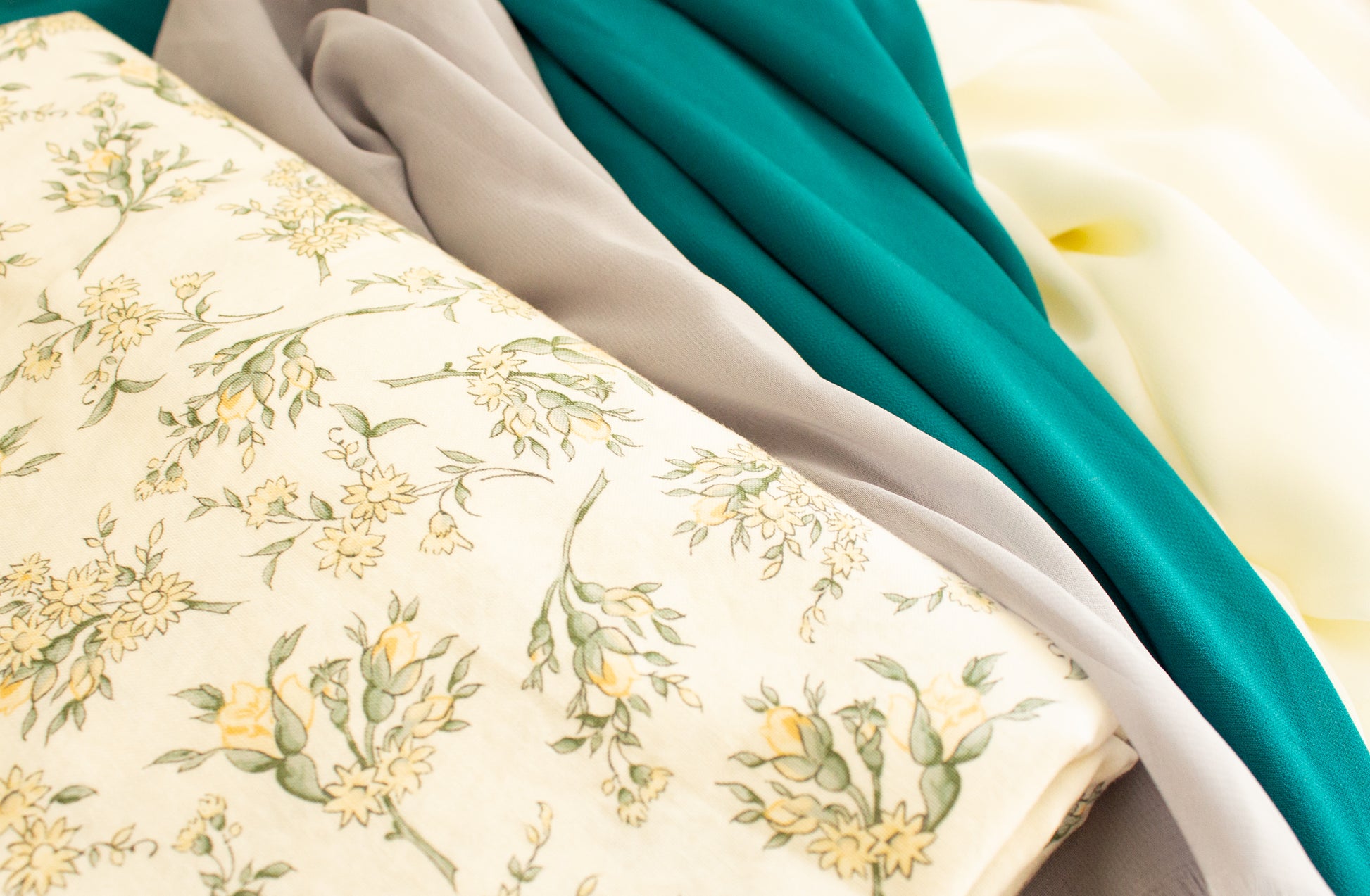Silver dove features gorgeous layers of chiffon in buttercream ivory, teal and silver with a delicate floral print with buttercream rose sprays.